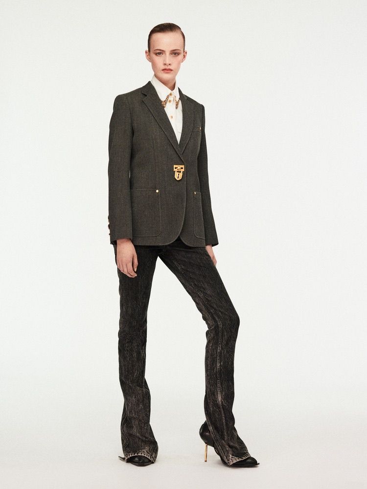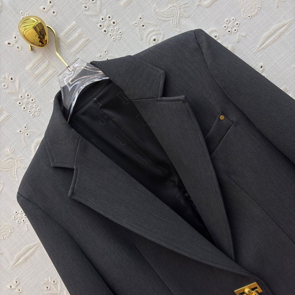 Không cần quá ồn ào, chỉ một chiếc blazer xám đậm với chi tiết khóa vàng lạ mắt cũng đủ khiến cả tổng thể trở nên đắt giá và có chiều sâu.