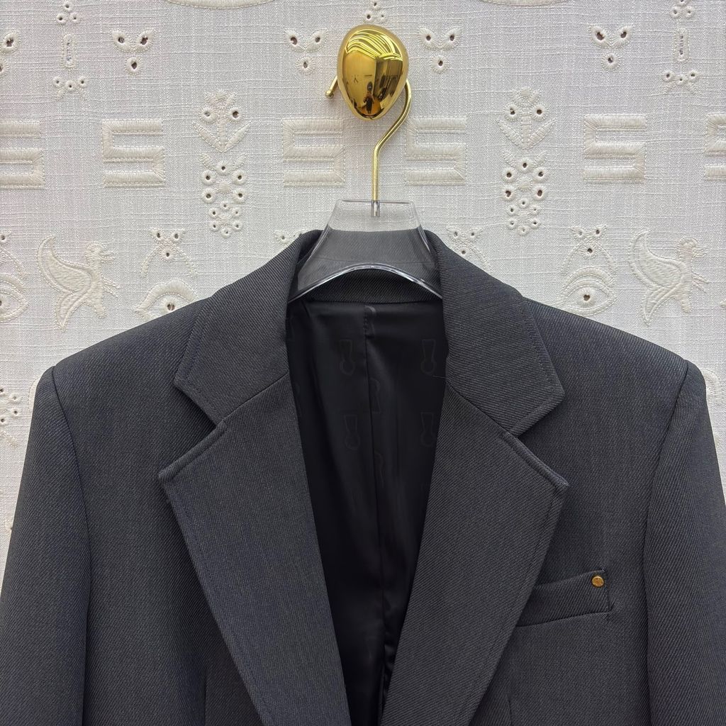 • Ve cổ cổ điển, đường cắt sắc nét, vai dựng nhẹ giúp phần trên cơ thể trông thẳng và thanh thoát.