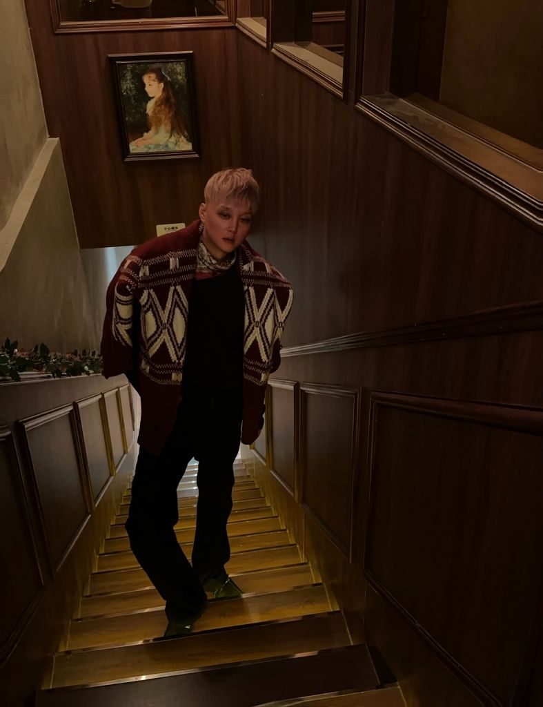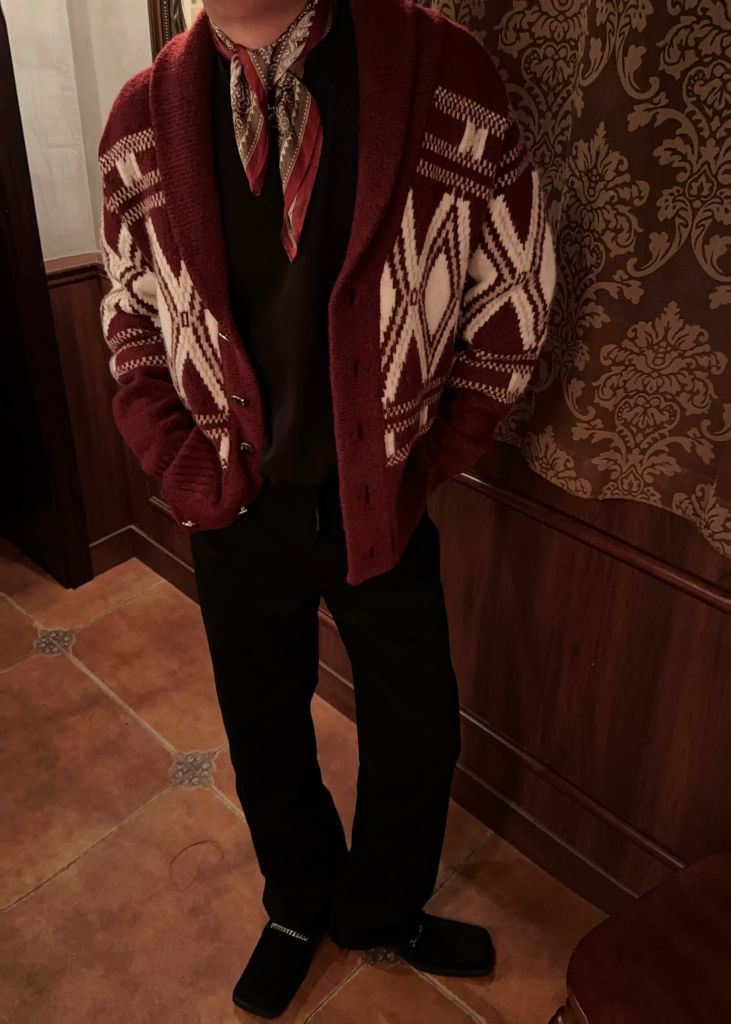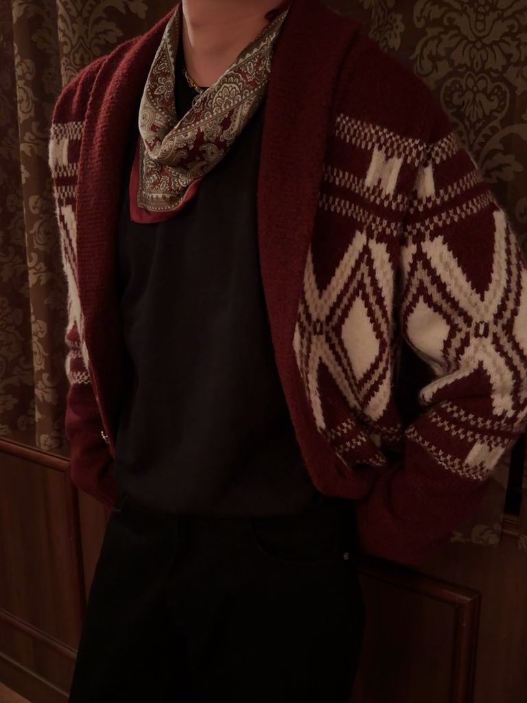 • Cổ shawl cardigan dày dặn, khi cài kín hay mở lơ lửng đều tôn phần cổ – vai nam tính