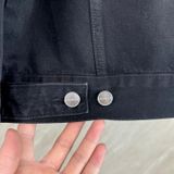 • Dáng trucker jacket cổ bẻ, hàng khuy kim loại, bố cục đường cắt gọn, lên form rõ ràng