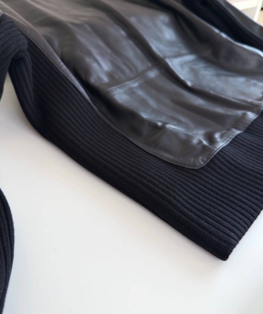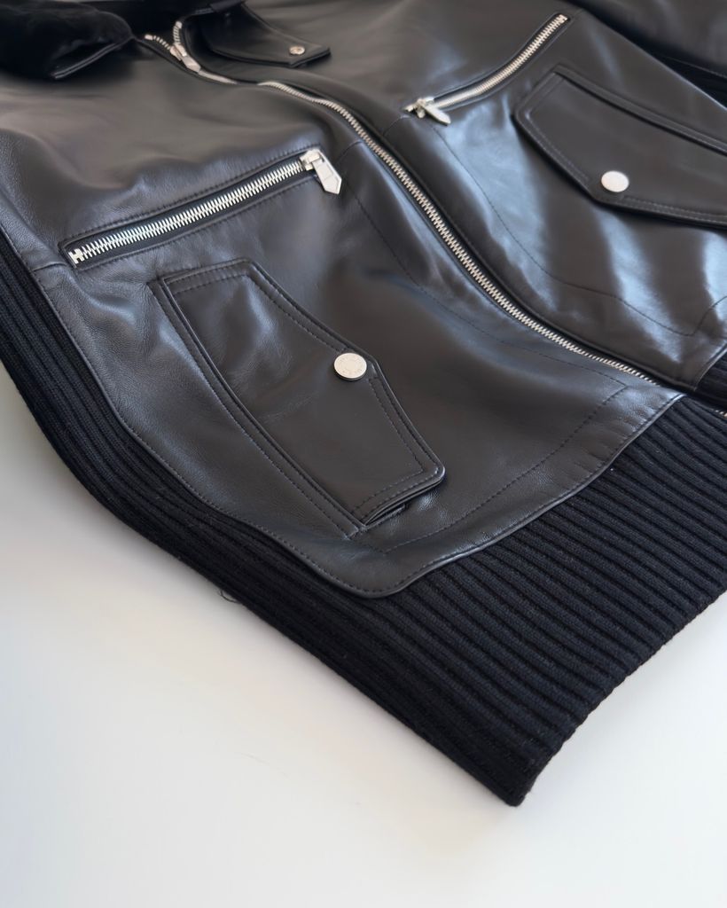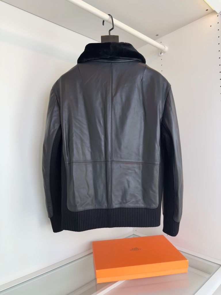 Một chiếc áo khoác “đủ đẳng cấp để nhìn là biết hàng xịn” – tối giản, nam tính, nhưng tạo dấu ấn rất mạnh nhờ chất da và phần cổ lông lật đầy khí chất.