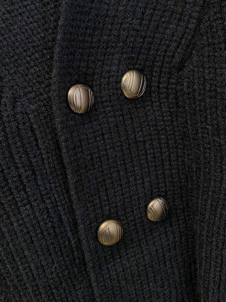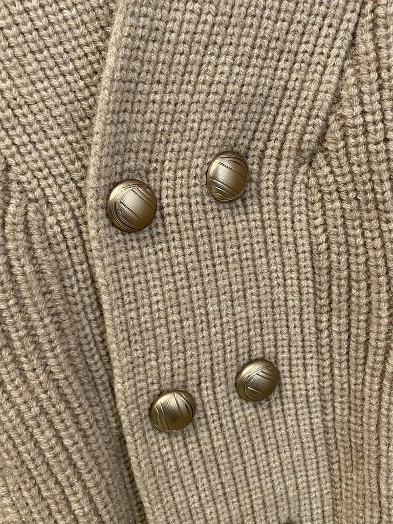 • Dáng cardigan cổ V, hàng nút kép tạo điểm nhấn cổ điển nhưng vẫn rất hiện đại