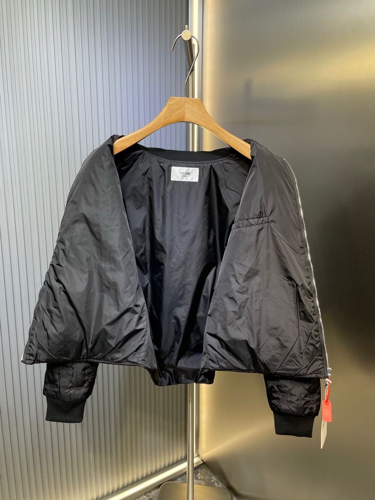 • Phom áo khoác bomber dáng vừa, dài ngang hông, tạo dáng gọn gàng, tôn vai ngực.