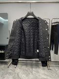 • Hàng nút kim loại ánh vàng nổi bật trên nền denim wash đen, tạo điểm nhấn sang, cá tính, đúng vibe thời trang runway.
