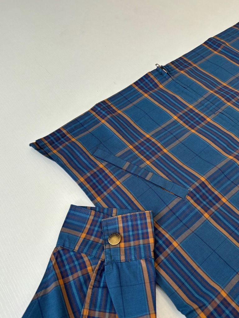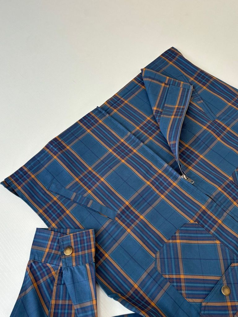 • Dáng áo khoác kiểu sơ mi, đường nét tối giản nhưng có chiều sâu nhờ họa tiết kẻ dệt nổi