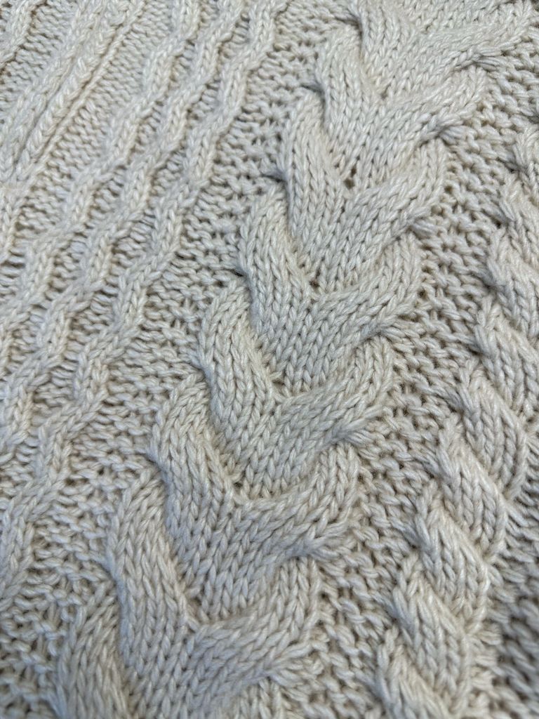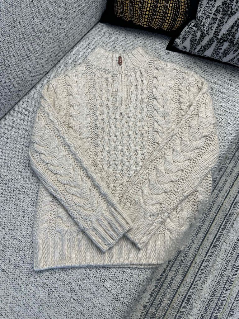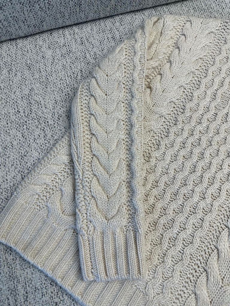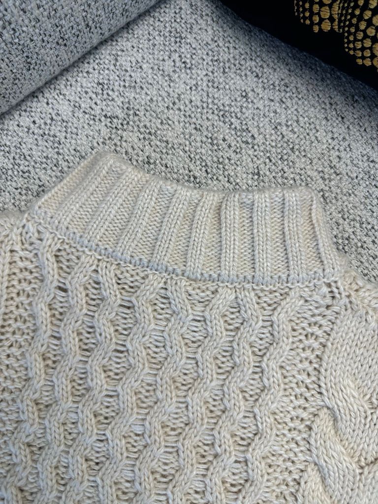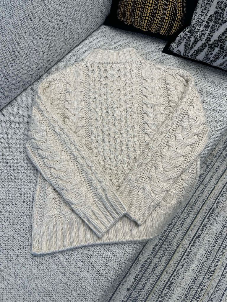 • Họa tiết dệt cable (vặn thừng) chạy dọc thân và tay, tạo hiệu ứng nổi khối sang trọng, nhìn kỹ càng càng đẹp.