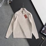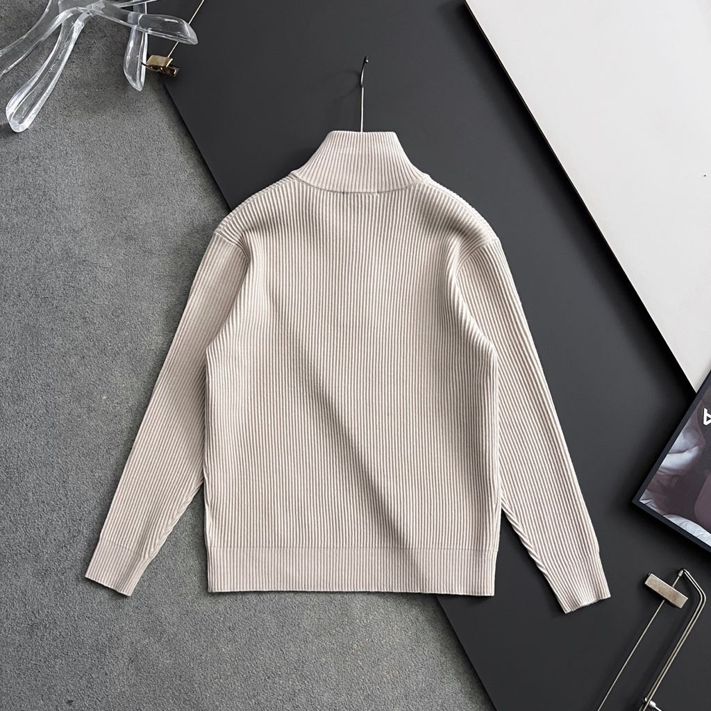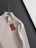 Một chiếc áo len “nhìn là thấy sang” nhờ bề mặt dệt gân sắc nét, điểm nhấn hoạ tiết signature tinh tế và dáng half-zip giúp tổng thể gọn gàng, hiện đại.