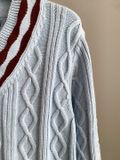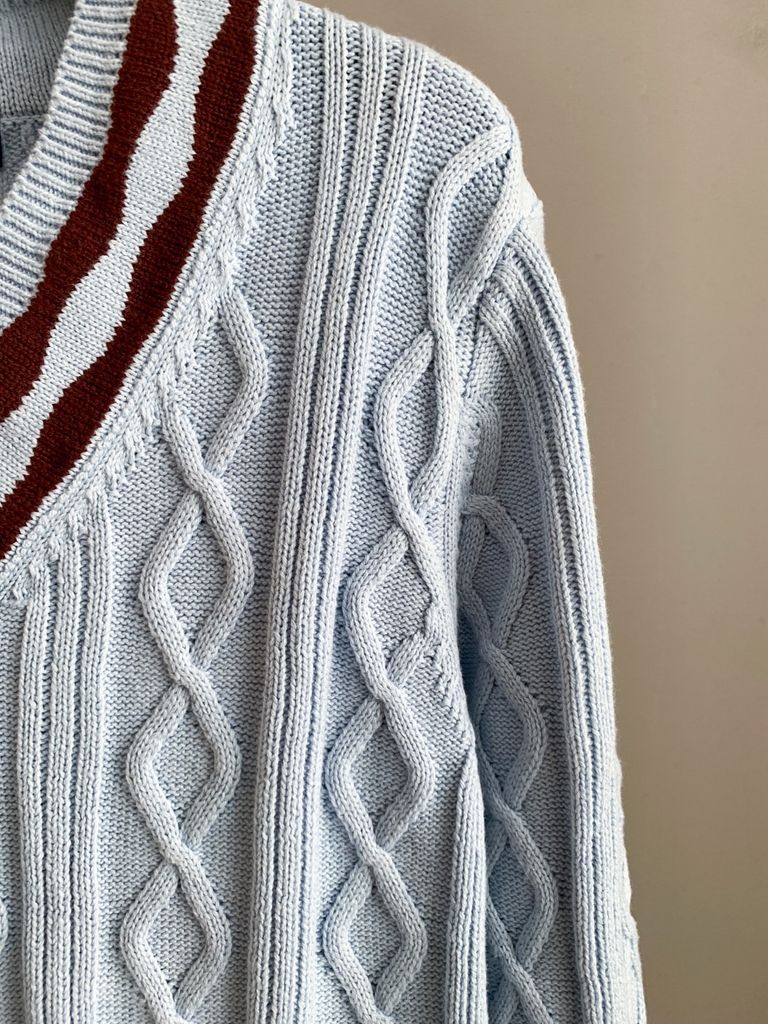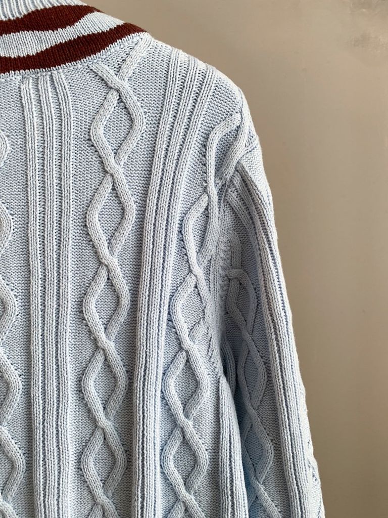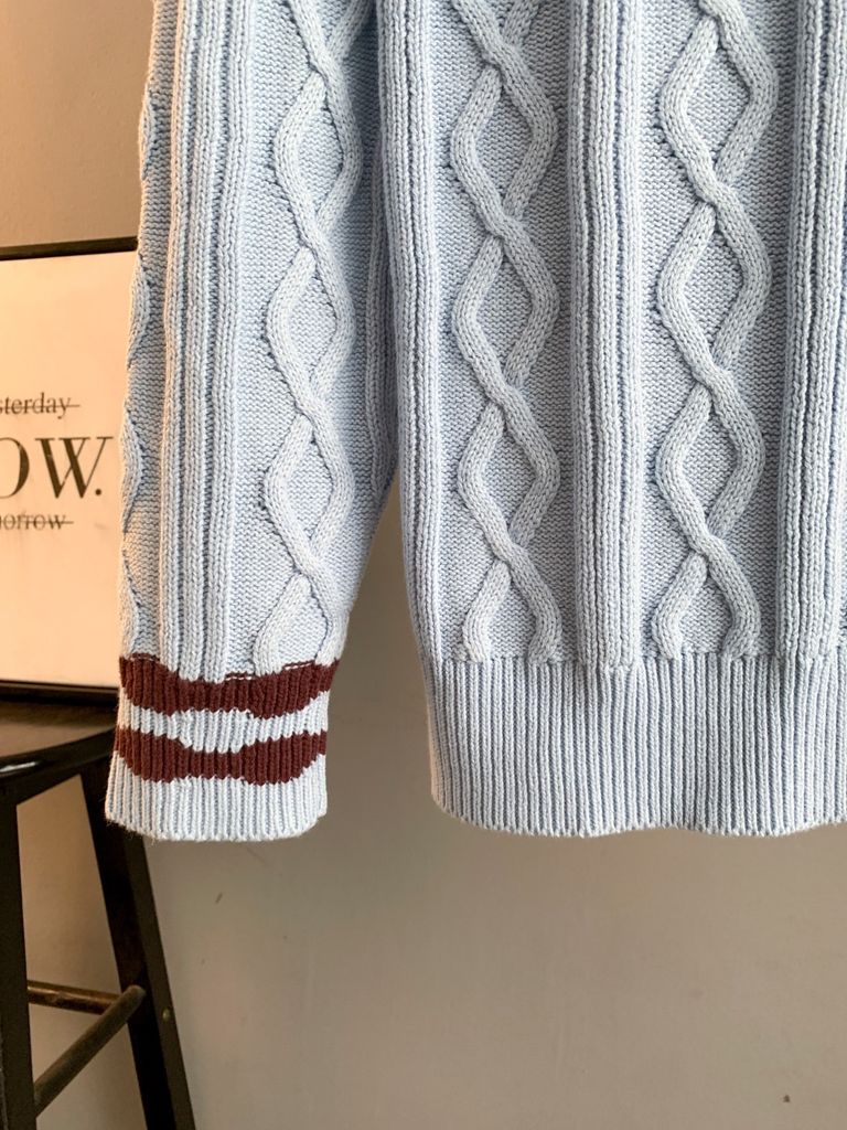 Chỉ nhìn đã thấy “ấm mắt” – tông xanh baby dịu nhẹ, cổ V viền sọc nâu – trắng nổi bật, lên dáng trẻ trung, hợp cả nam lẫn nữ trong mọi set đồ ngày lạnh.