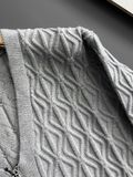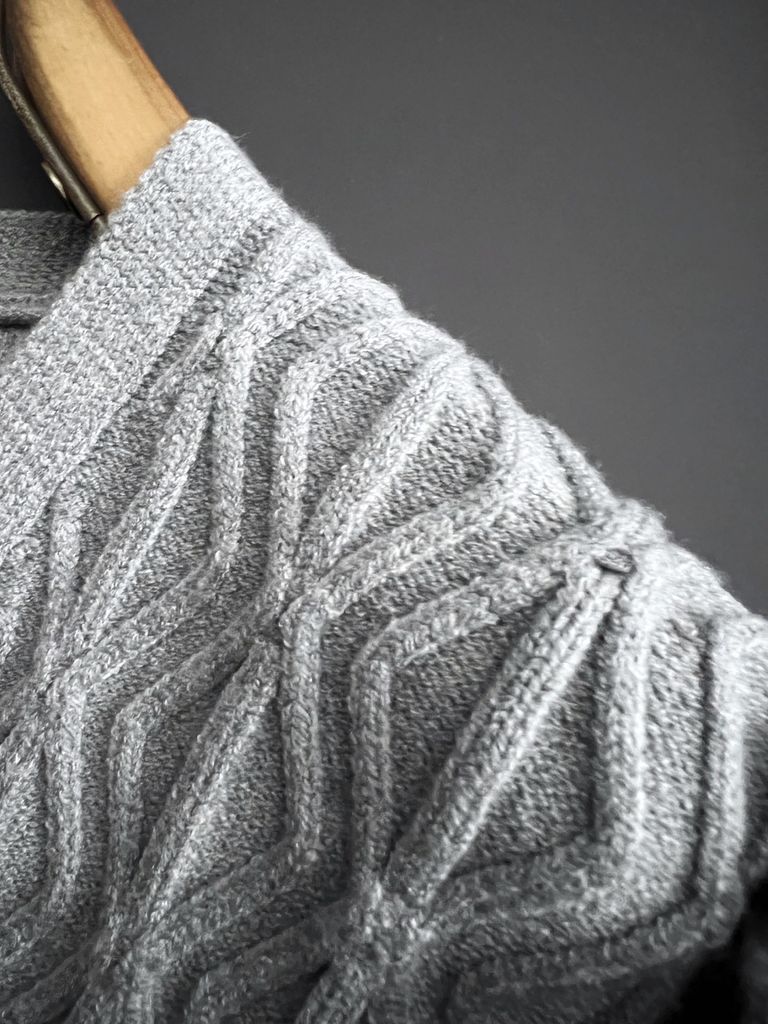 • Thân trước là mảng len dệt tổ ong và cable đan xen, tạo hiệu ứng nổi 3D rõ nét, rất “editorial” kiểu châu Âu.