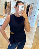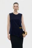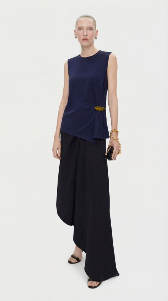 • Điểm nhấn nổi bật nằm ở chi tiết ghim môi kim loại đặt tại phần eo lệch, tạo nếp rút tự nhiên và hiệu ứng drape nhẹ rất đẹp mắt.