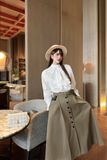 Chiếc đầm dài với hàng nút lệch độc đáo, nhấn nhá những đường draping tinh tế, tạo cảm giác “sang trầm” đúng kiểu châu Âu – mặc đi làm hay đi hẹn hò đều nổi bật mà vẫn giữ được sự kín đáo, thanh lịch.