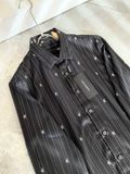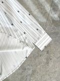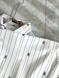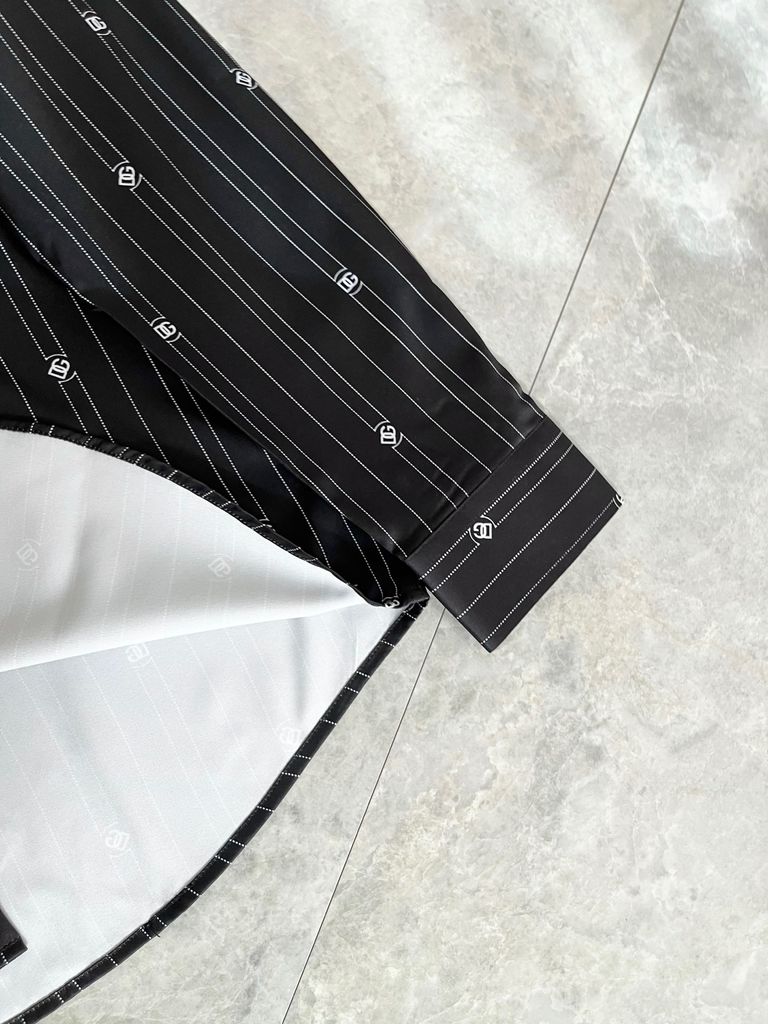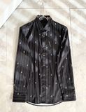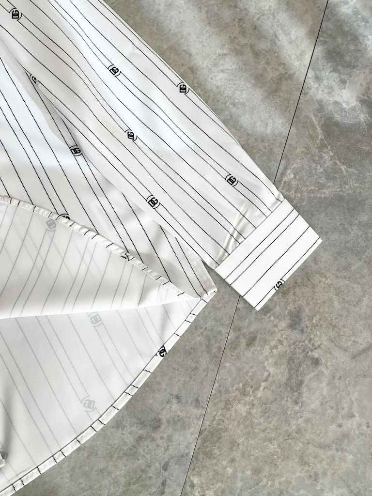Một thiết kế sơ mi “chuẩn chỉn chu” nhưng vẫn có điểm nhấn đủ khác biệt để nhìn là nhận ra: kẻ sọc thanh thoát, logo mini rải đều và hiệu ứng chuyển sắc nhẹ tạo chiều sâu rất hiện đại.