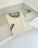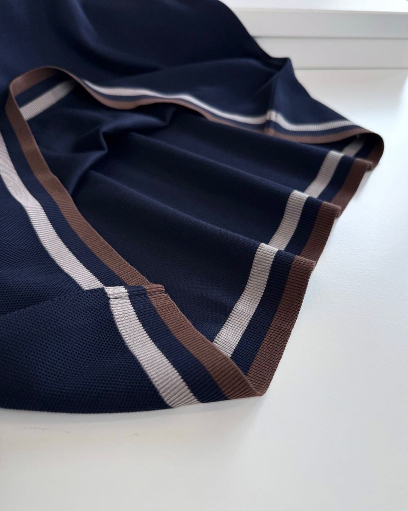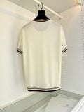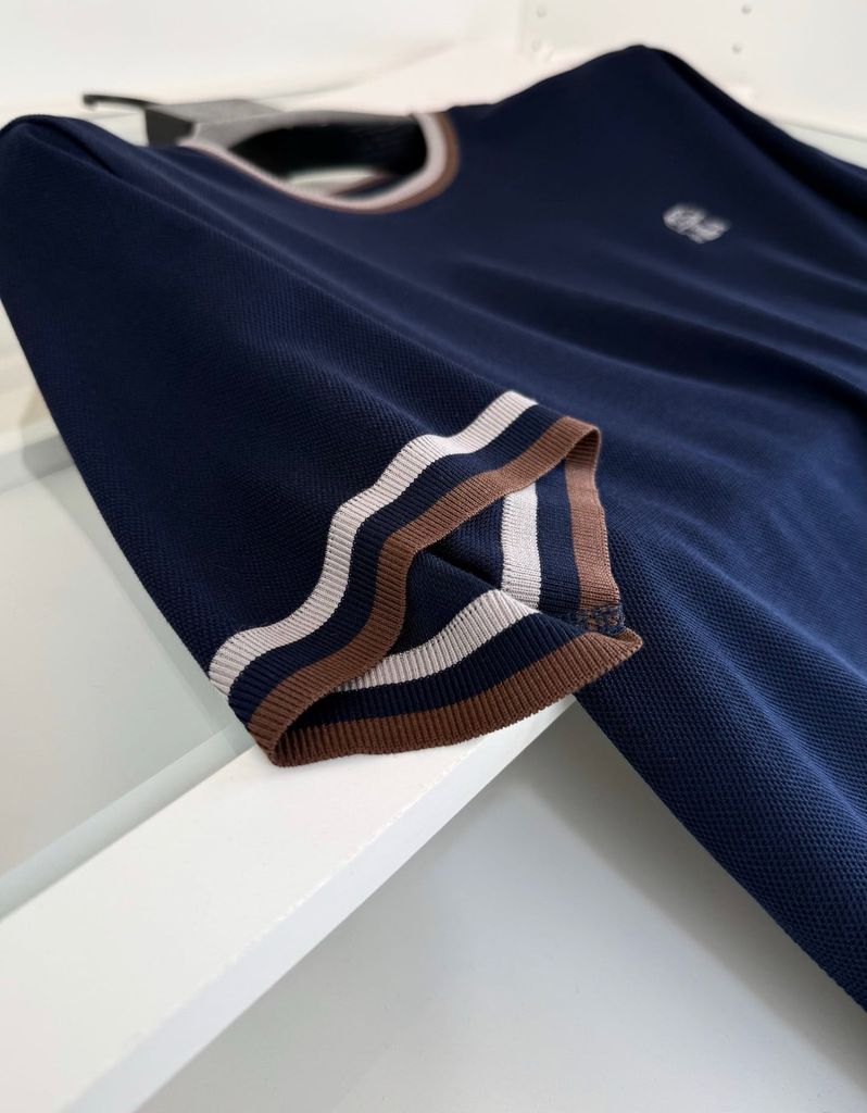 • Dáng áo ngắn tay cổ tròn, xử lý viền cổ tay và gấu áo bằng sọc phối màu tạo điểm nhấn tinh tế, nhìn tổng thể rất có chiều sâu.