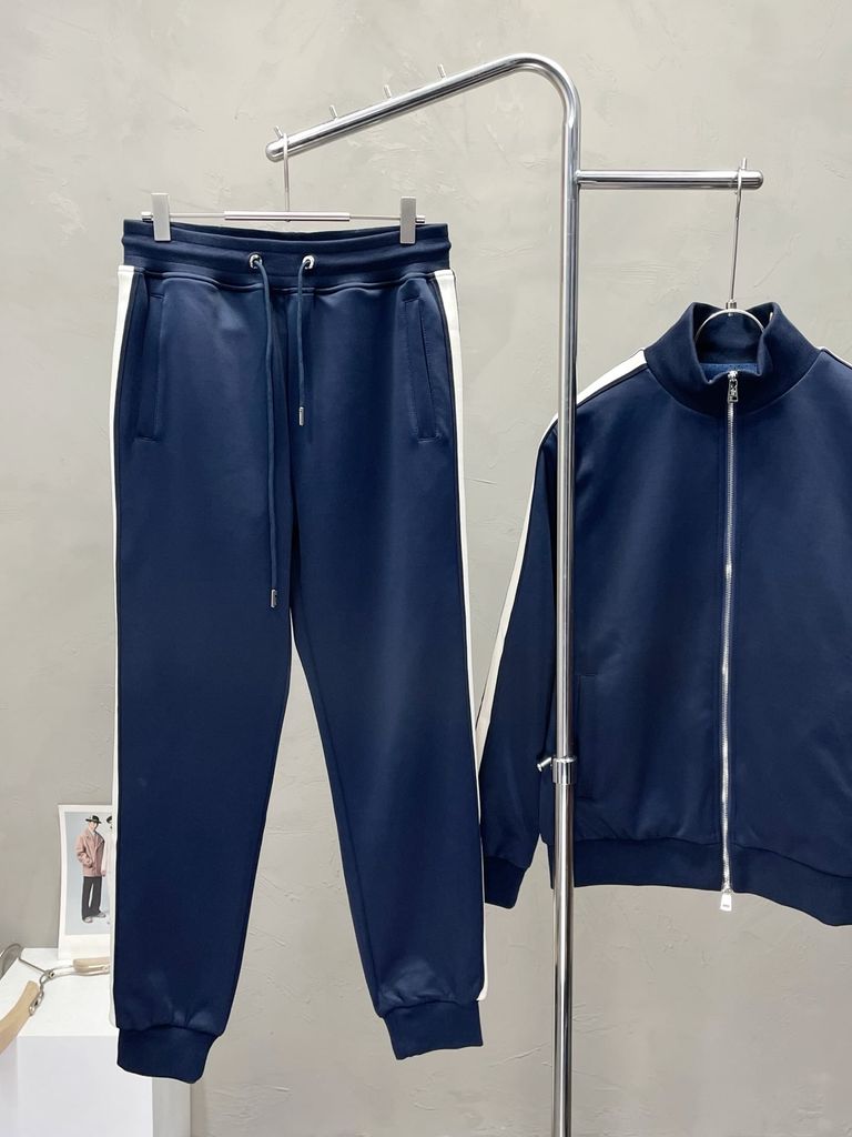 • Áo khoác cổ đứng, khóa kéo mượt; quần jogger lưng chun kèm dây rút đầu kim loại.