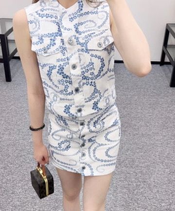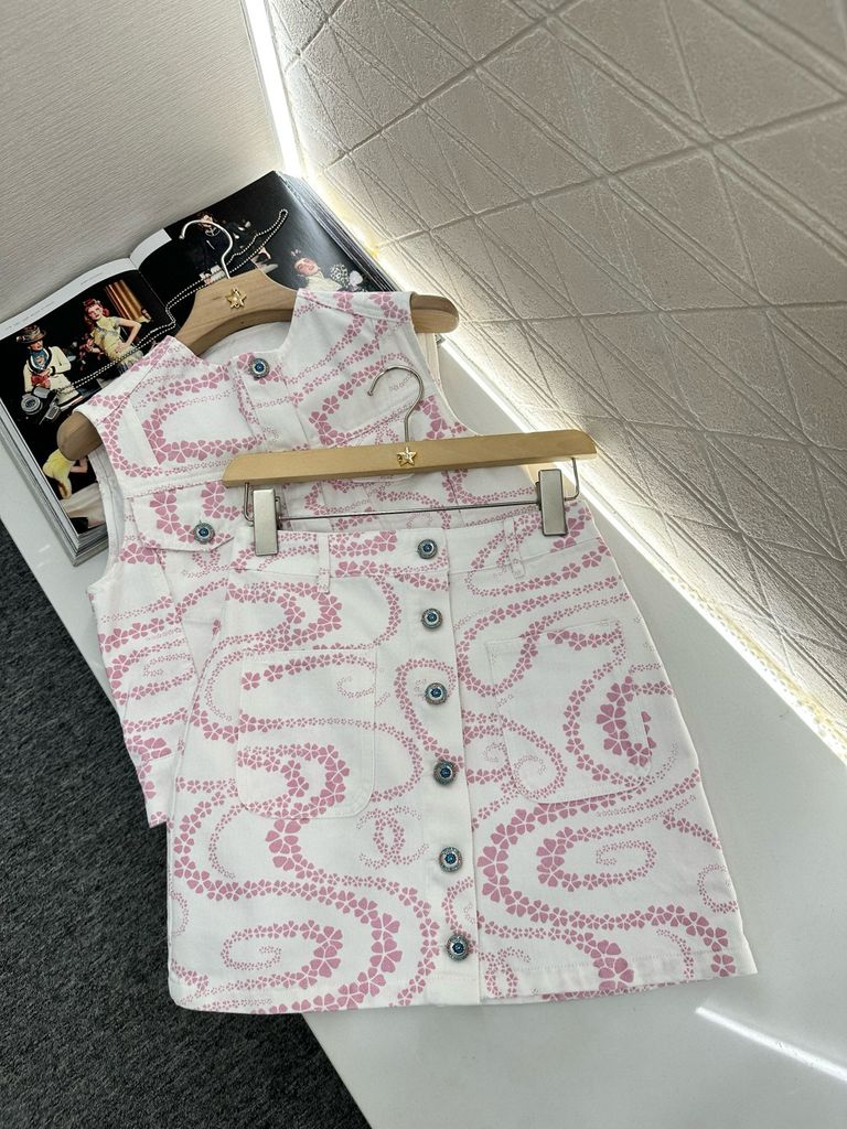 Bộ váy CHNEL* hoạ tiết Bloom Chain” Denim Skirt Set – Vest sát nách & chân váy cạp cao, chuẩn “hot trend” 2025: áo 1400k/ váy 1250k