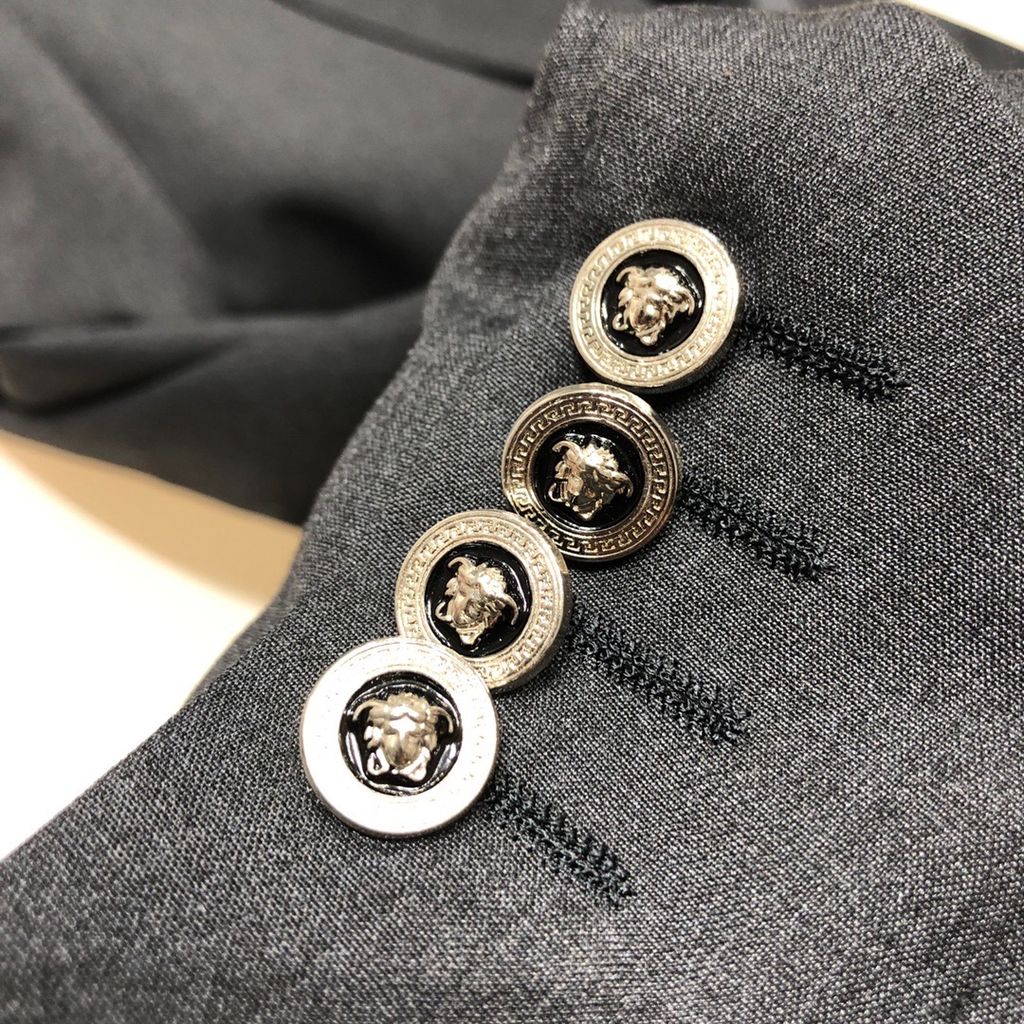 • Hàng cúc kim loại in họa tiết biểu tượng, tạo điểm nhấn đẳng cấp trên nền vải xám trầm.