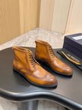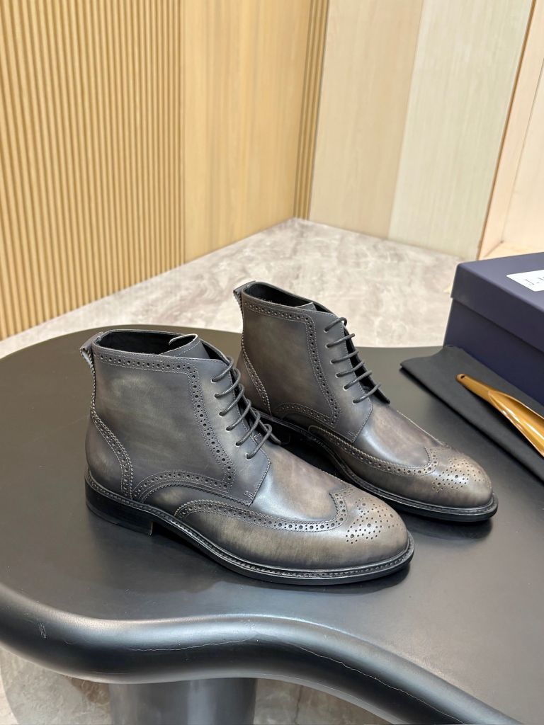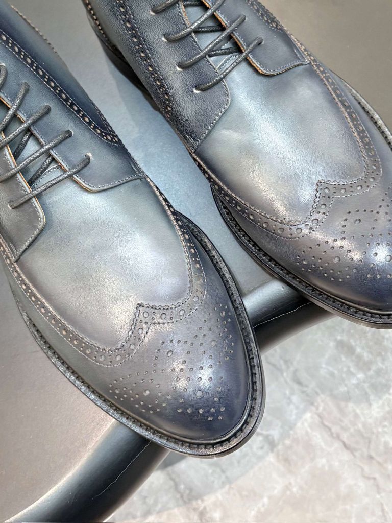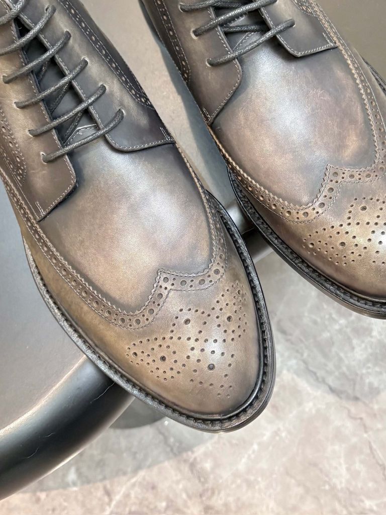 Một đôi boot lace-up dáng tây cổ lửng, patina xám khói ánh nâu được xử lý thủ công từng lớp màu – nhìn đã thấy “đắt giá”, đi lên chân là hiểu ngay vì sao không dành cho số đông.