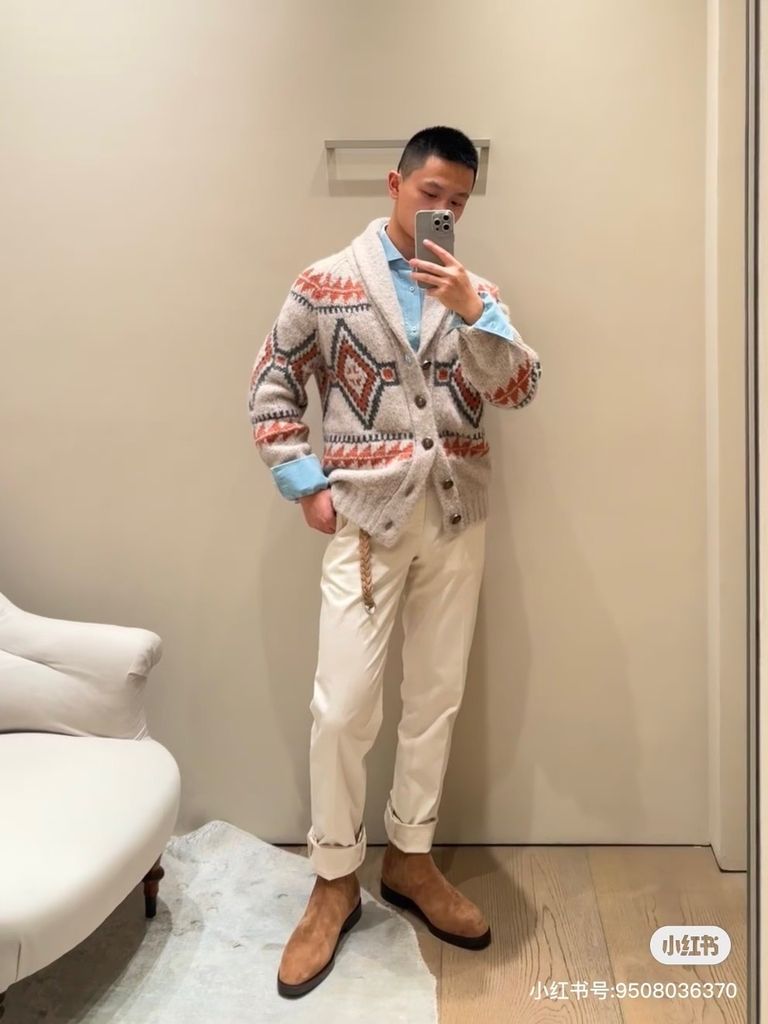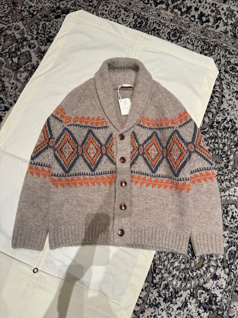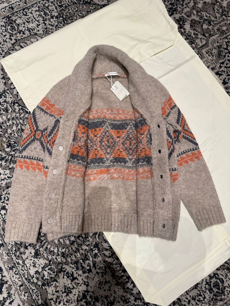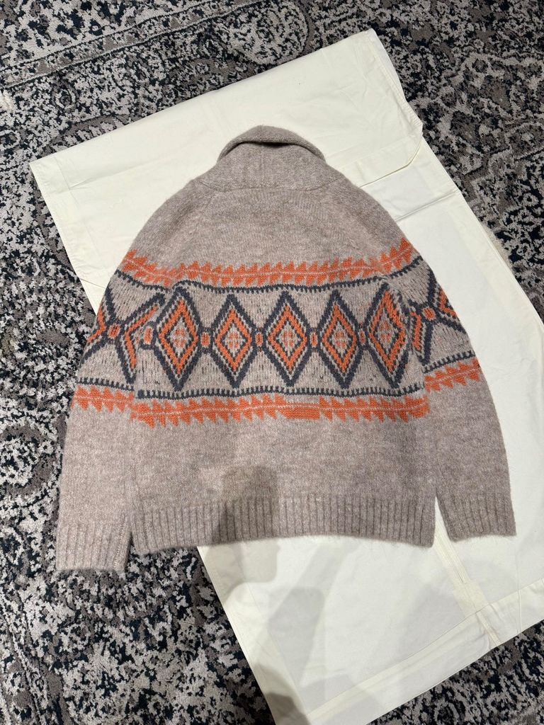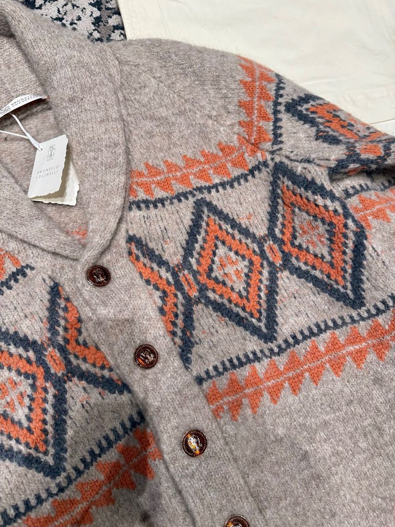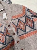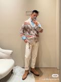 Một chiếc cardigan nhìn là nhận ra “gu”: hoạ tiết hình học nổi bật, phom chuẩn chỉnh và chất len lên form cực đẹp — dành cho anh chị thích đồ hiếm, không đại trà.
