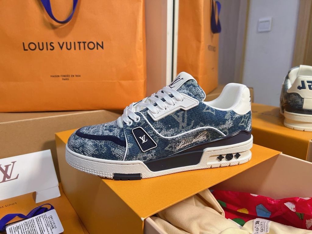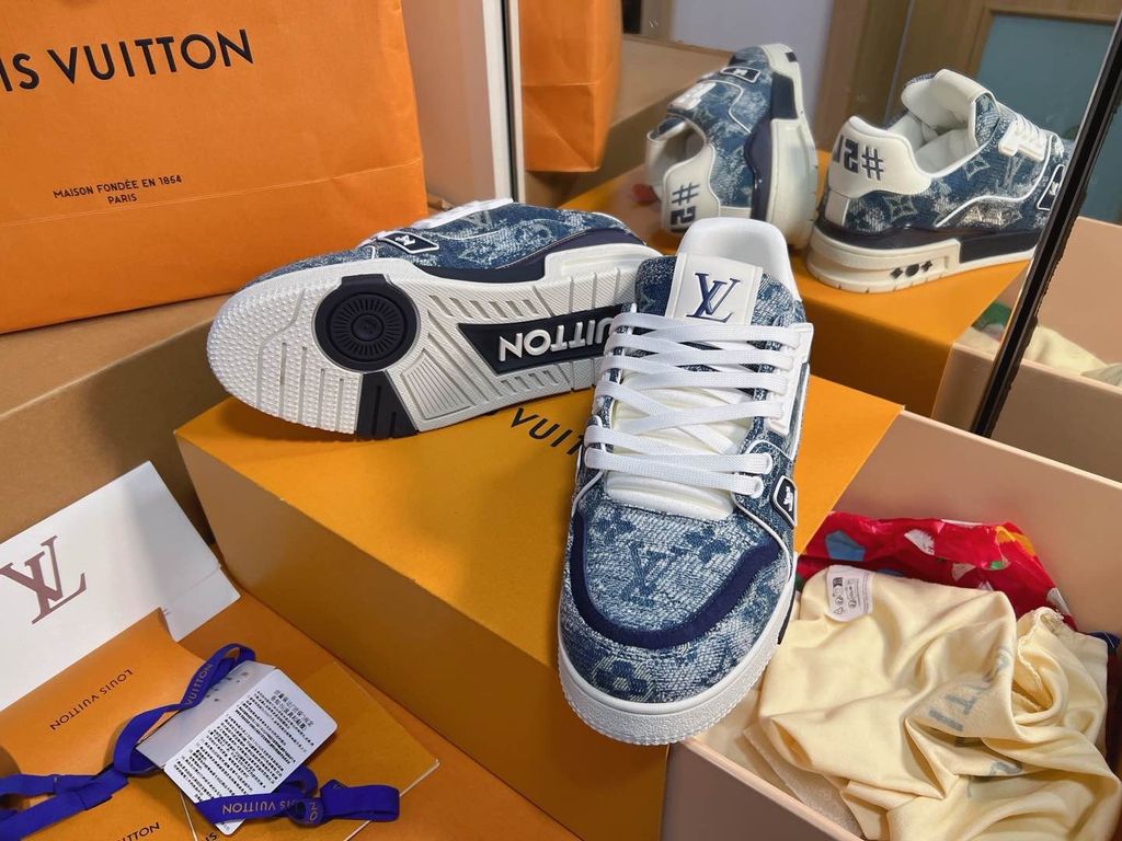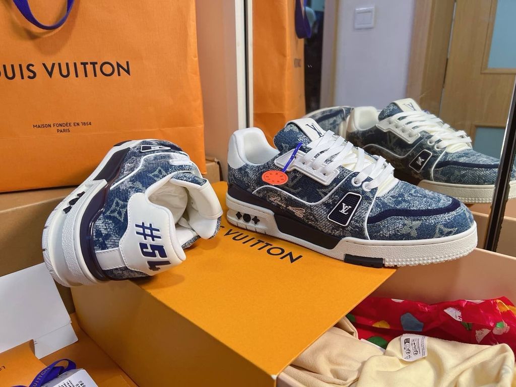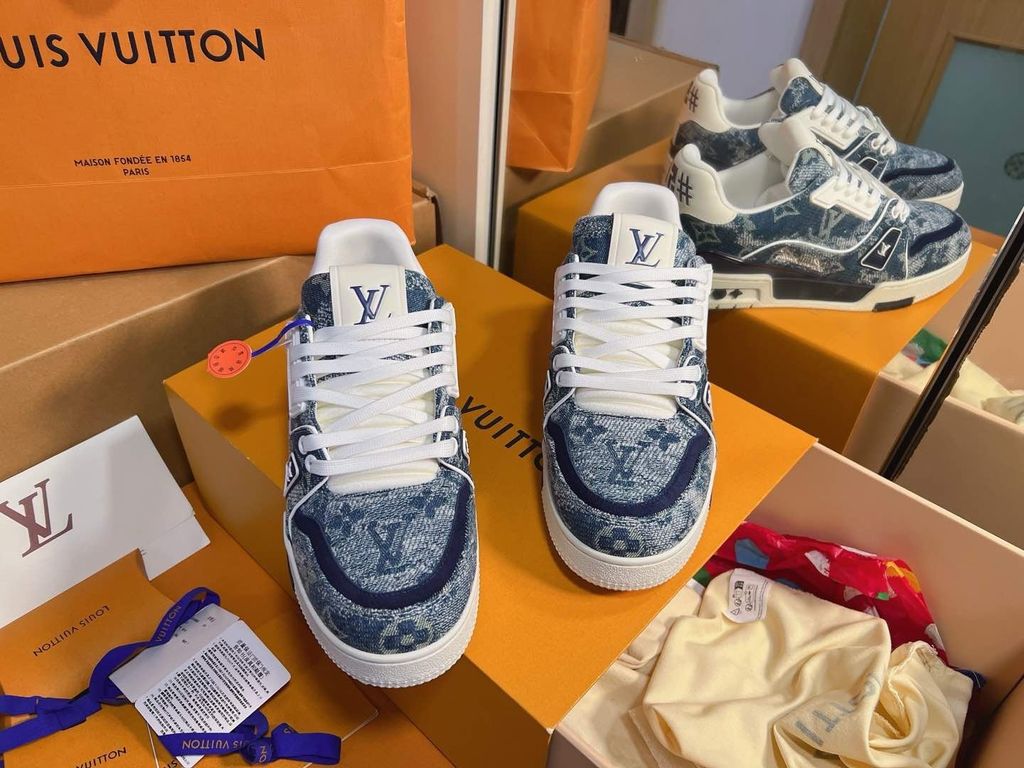 • Phiên bản sneaker LV* denim monogram phối trắng – nhìn là thấy chất chơi, lên chân cực bắt mắt, hack style streetwear sang hơn hẳn.
