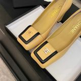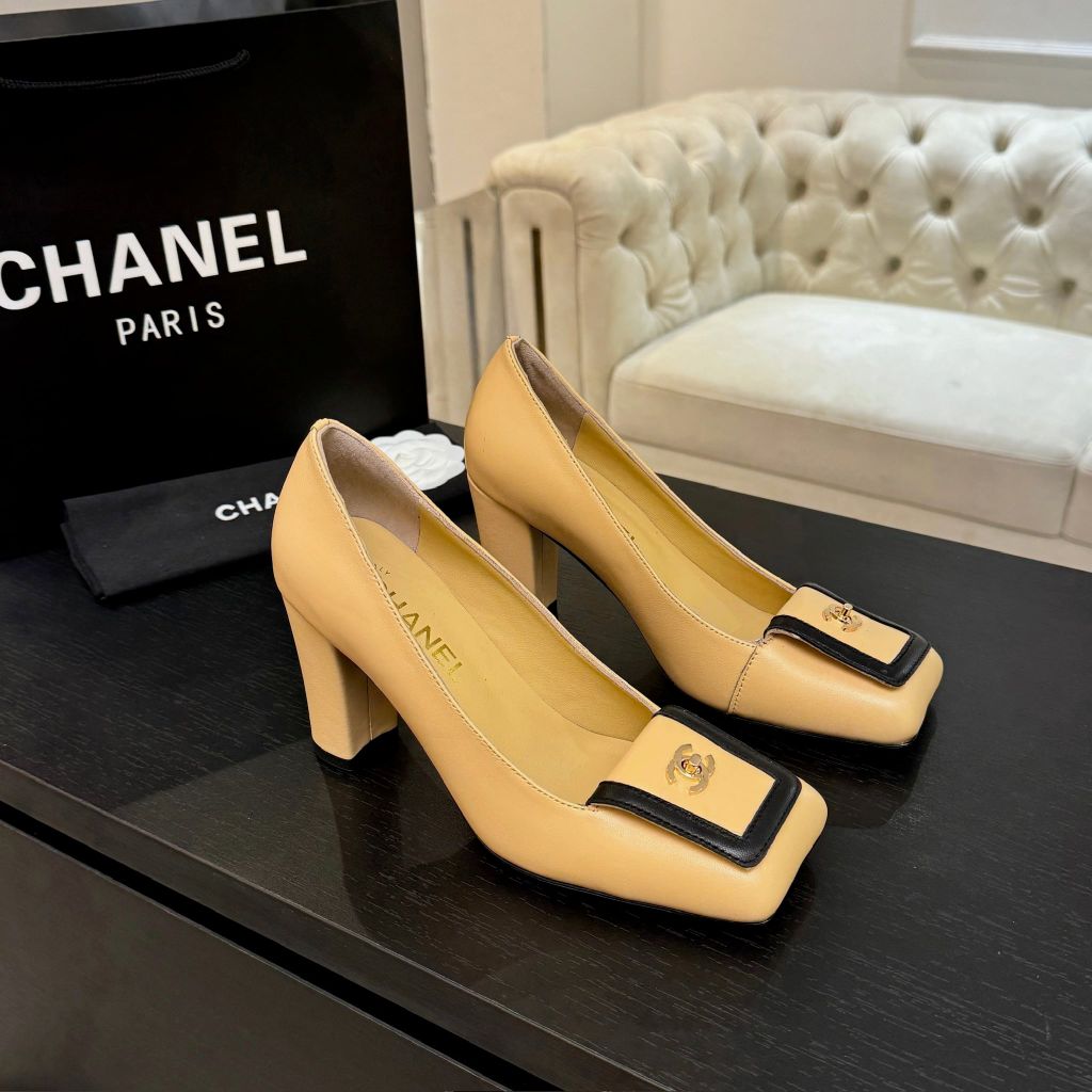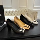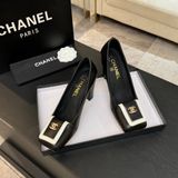 GIÀY NỮ CAO GÓT CHAN* MŨI VUÔNG RUNWAY 25K – LOGO KIM LOẠI, GÓT TRỤ VỮNG 1600k (HÀNG ORDER QUỐC TẾ)