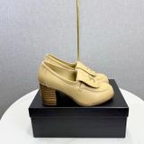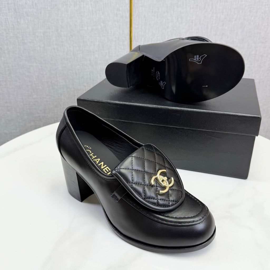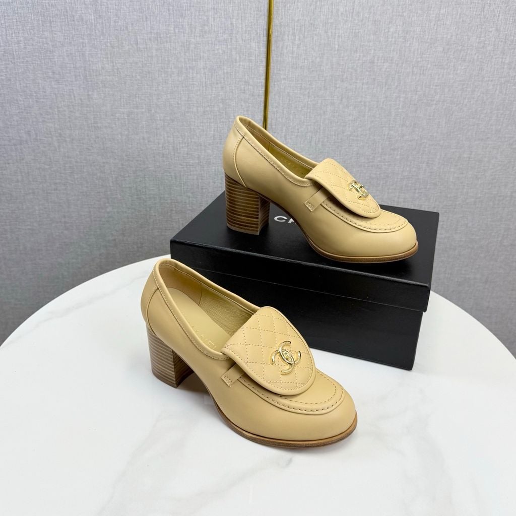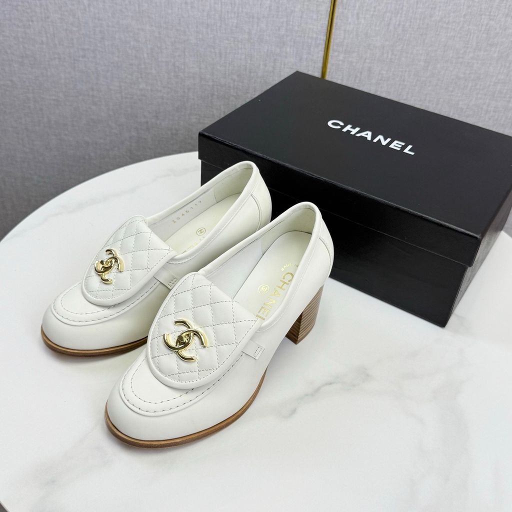 GIÀY NỮ CHANE* LOAFER GÓT CAO TRẮNG LOGO VÀNG 1850k (HÀNG ORDER QUỐC TẾ)
