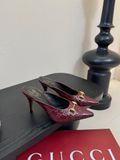 Phiên bản mule gót cao 2025 của GUCC* với tông đỏ rượu vang trầm, D-logo kết hợp khóa móc ngựa vàng nổi bật, là đôi giày lý tưởng để nâng cấp mọi set đồ từ ngày sang đêm. Dáng mũi nhọn, hở gót thời thượng tôn dáng chân thon dài và rất “đúng chất” quý cô hiện đại.
