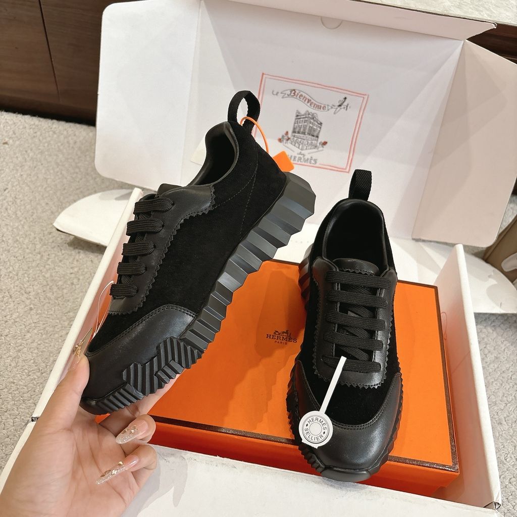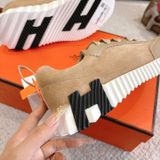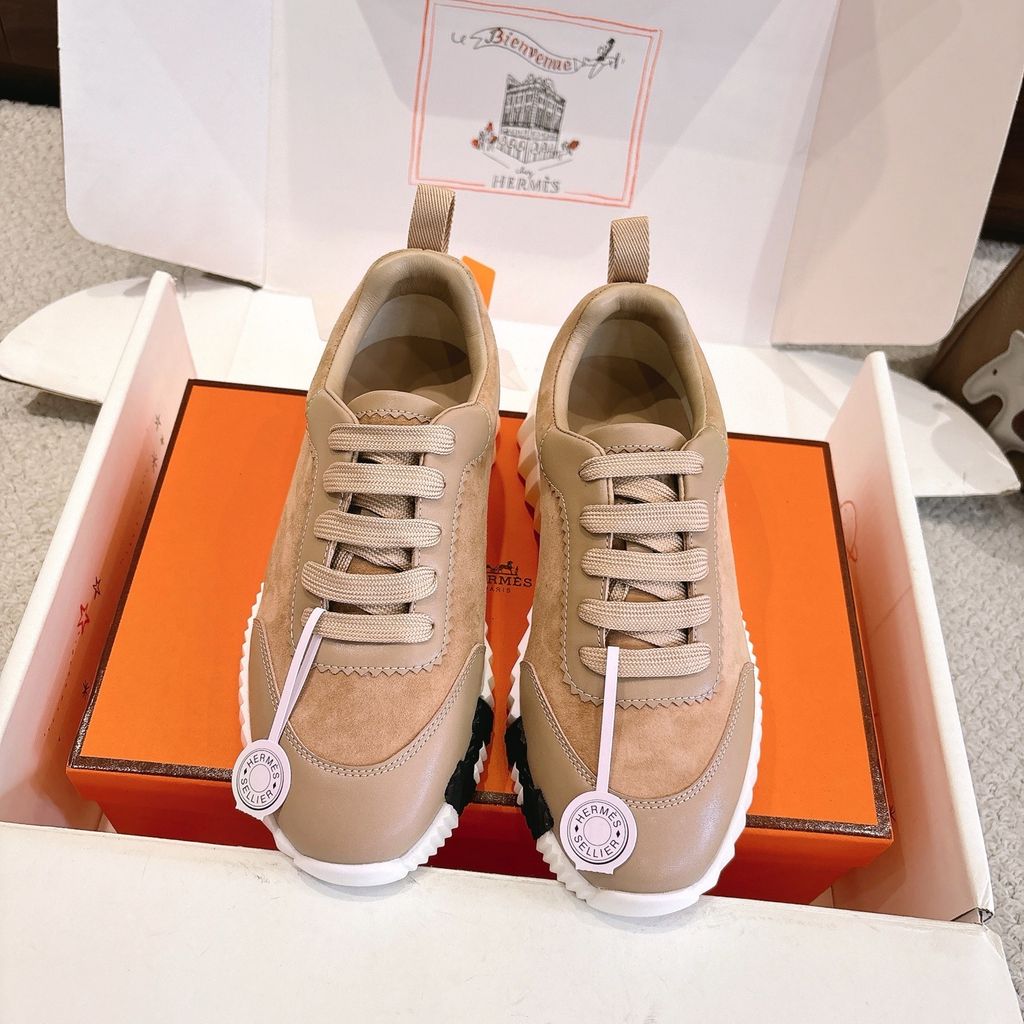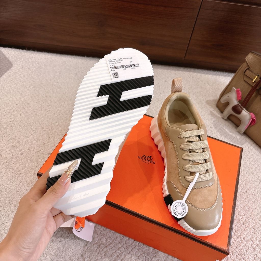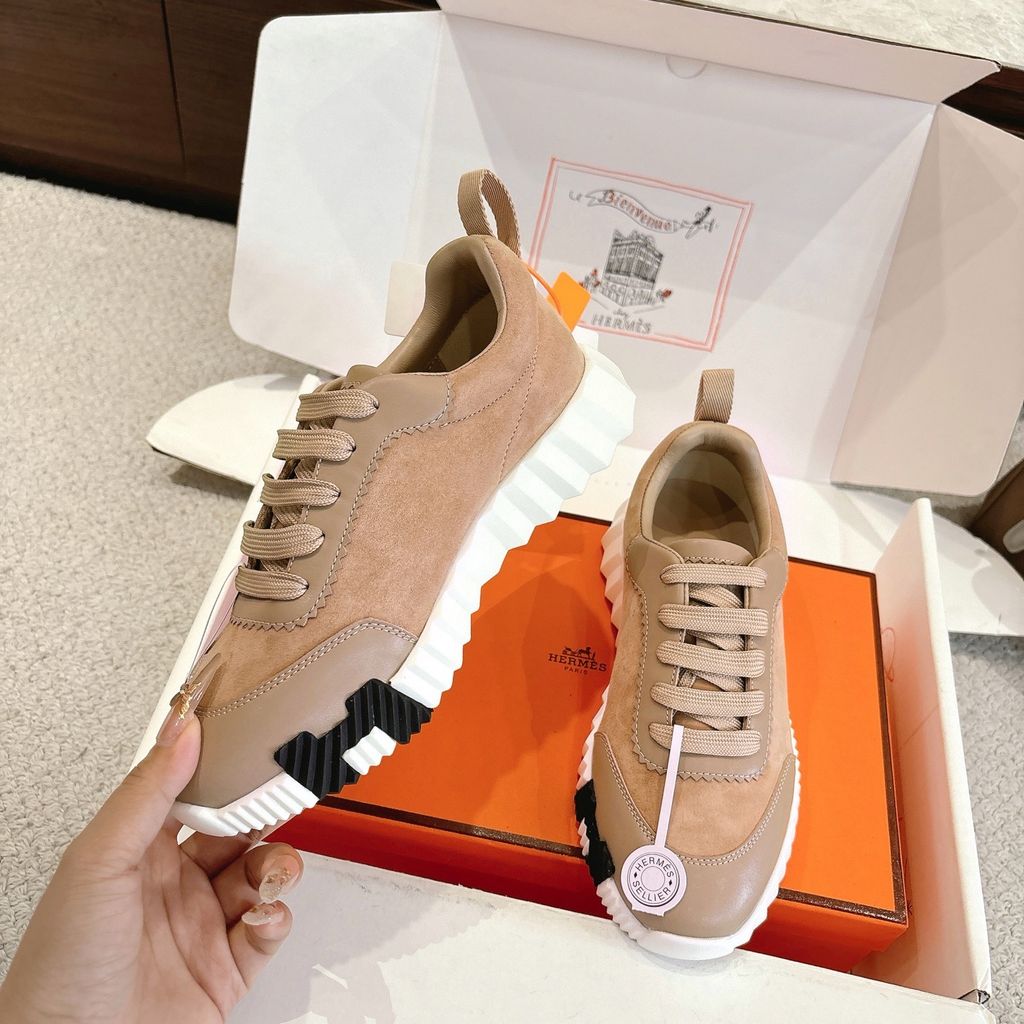• Tông nâu ấm phối đế trắng nổi khối chữ H hai bên hông, nhìn là nhận ra ngay chất chơi “sporty luxury”.