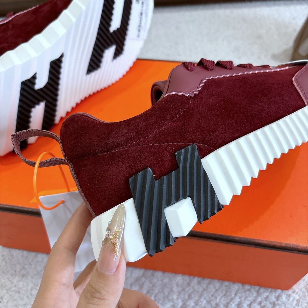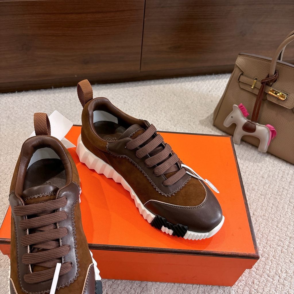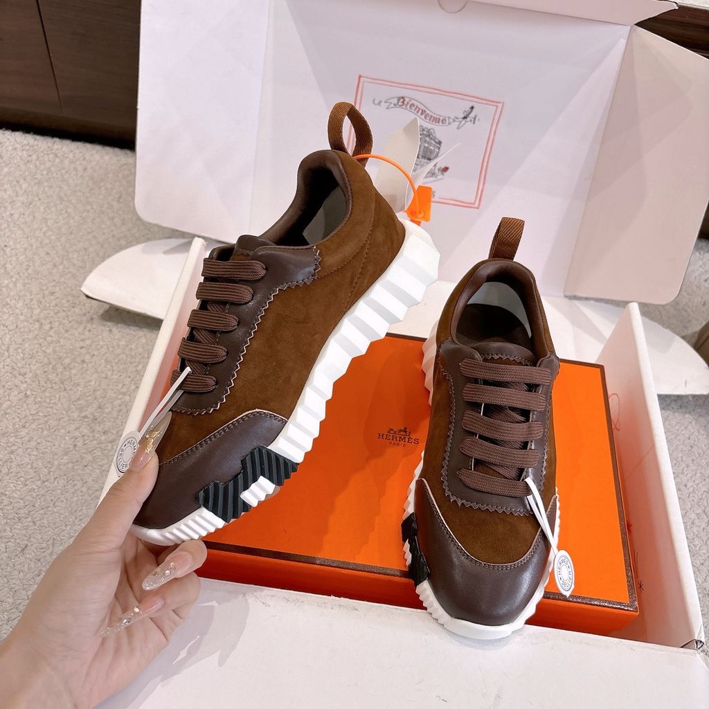 • Tông nâu ấm phối đế trắng nổi khối chữ H hai bên hông, nhìn là nhận ra ngay chất chơi “sporty luxury”.
