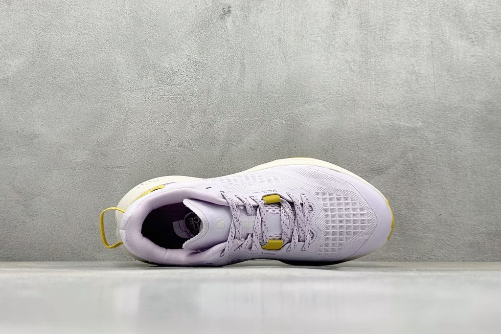 • Gót có đệm ôm chắc, tab kéo bản lớn màu vàng tạo điểm nhấn; mảng phủ tím hai bên tăng độ nâng đỡ.