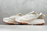 Phom low-top hiện đại, phối trắng–tím nhạt điểm vàng nổi bật; khi mang gọn gàng, năng động cho trekking, đi bộ đường dài và cả di chuyển hằng ngày.