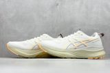 Phom low-top hiện đại, phối trắng–tím nhạt điểm vàng nổi bật; khi mang gọn gàng, năng động cho trekking, đi bộ đường dài và cả di chuyển hằng ngày.