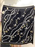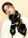 • Tạo điểm nhấn thanh lịch ngay khi quàng: họa tiết chuỗi ngọc & dây xích tương phản trên nền đen, tôn khí chất sang trọng.