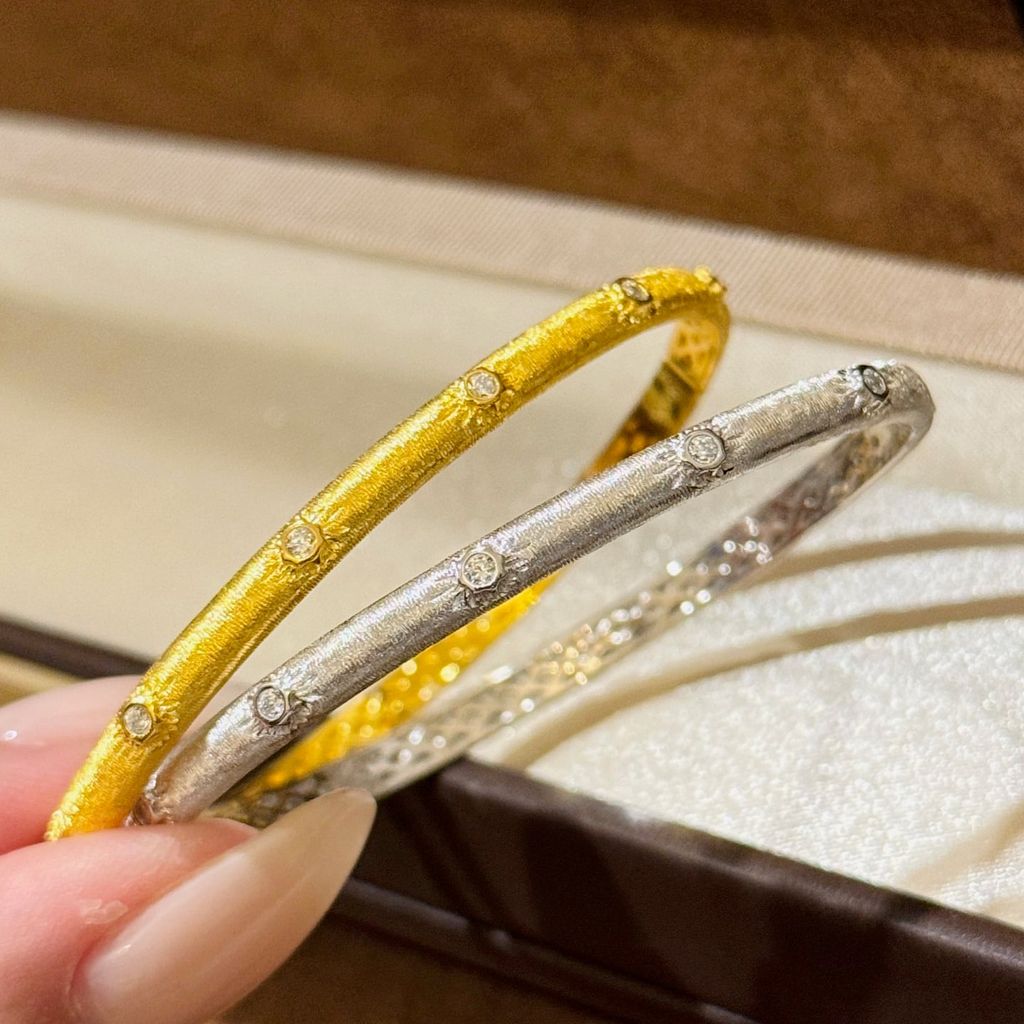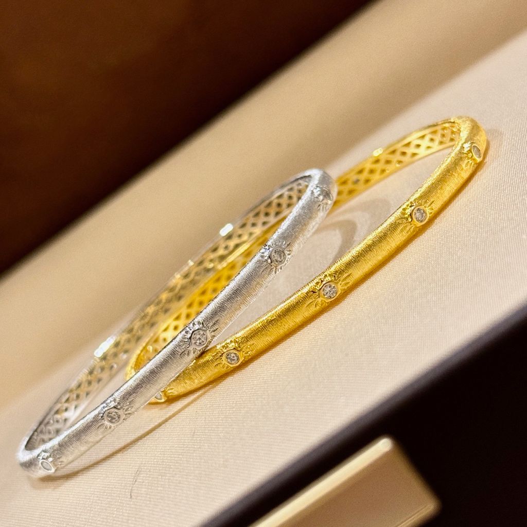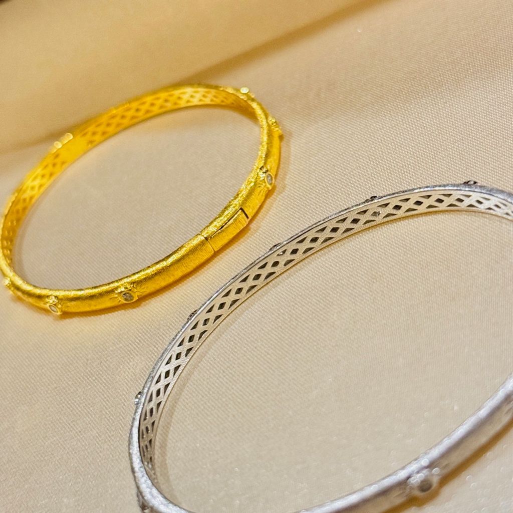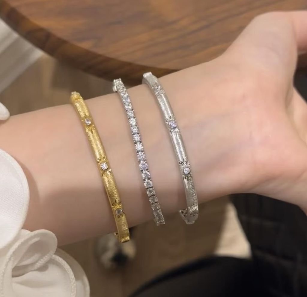 • Combo hai tông màu: vàng 18K nổi bật và ánh bạch kim lạnh sang, có thể đeo đơn, đeo đôi hoặc mix nhiều chiếc để tạo layer cá tính.