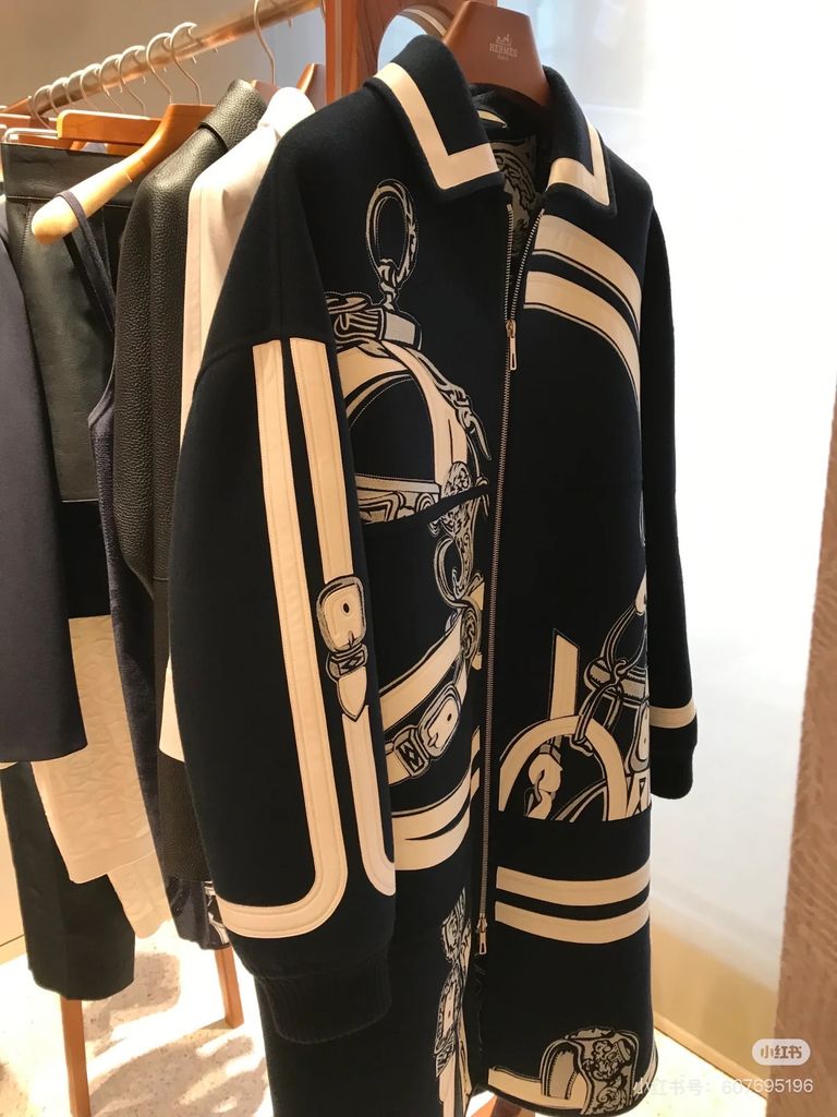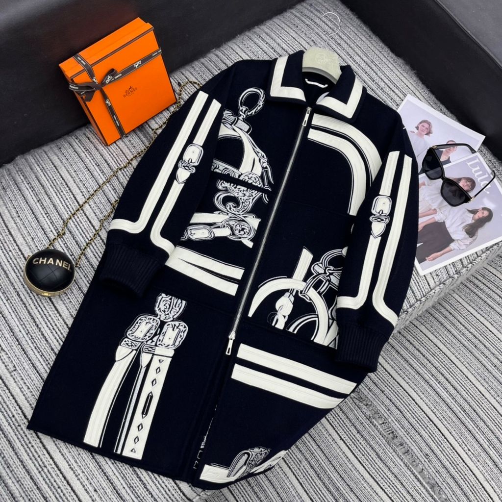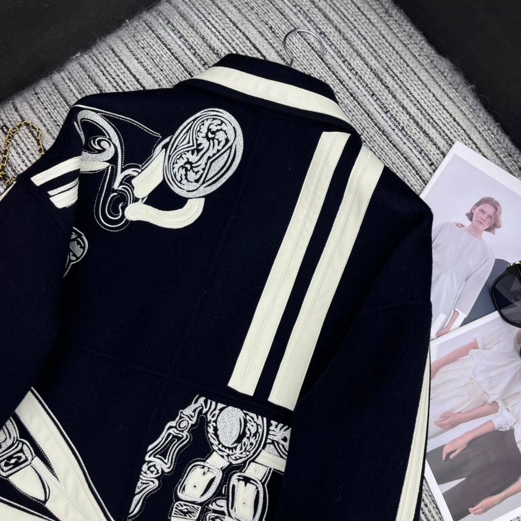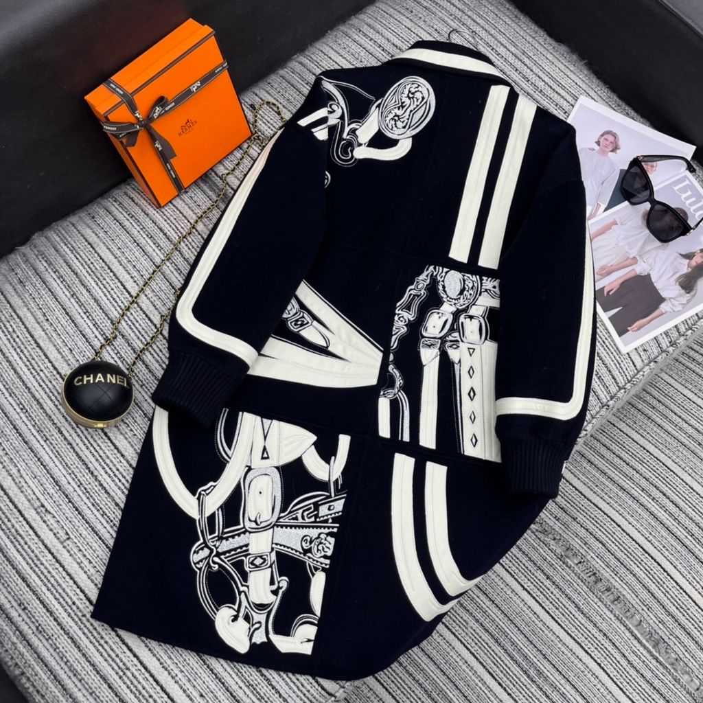 ÁO KHOÁC DẠ NỮ HERM* THÊU HÌNH NGHỆ THUẬT PHỐI DA CỪU DÁNG DÀI 6950K (HÀNG ORDER QUỐC TẾ)