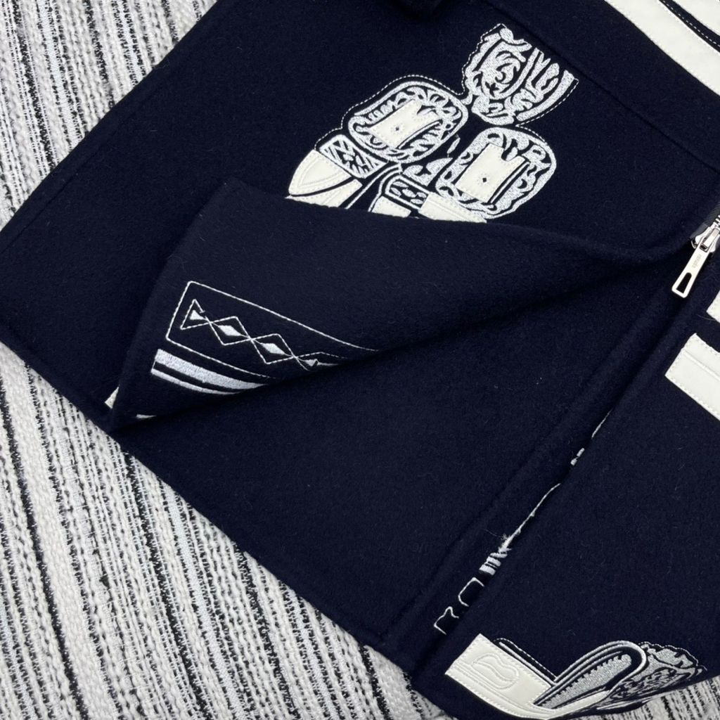 • Đường viền phối da cừu chạy dọc thân áo kết hợp mảng thêu nghệ thuật định vị, tạo điểm nhấn đắt giá khi nhìn từ bất kỳ góc độ nào.