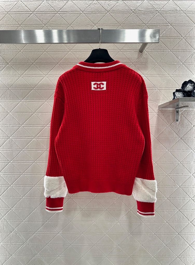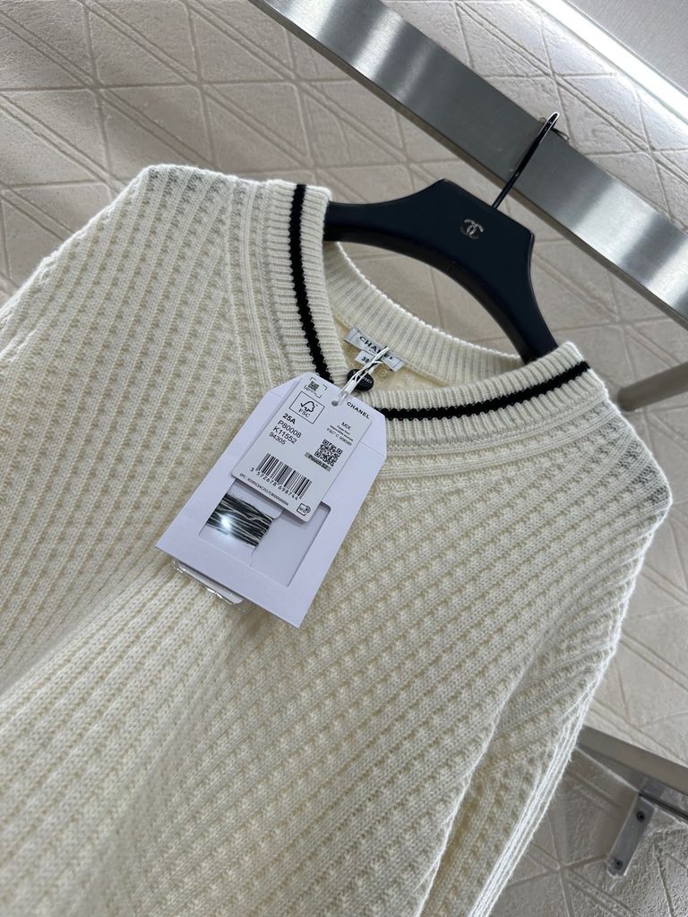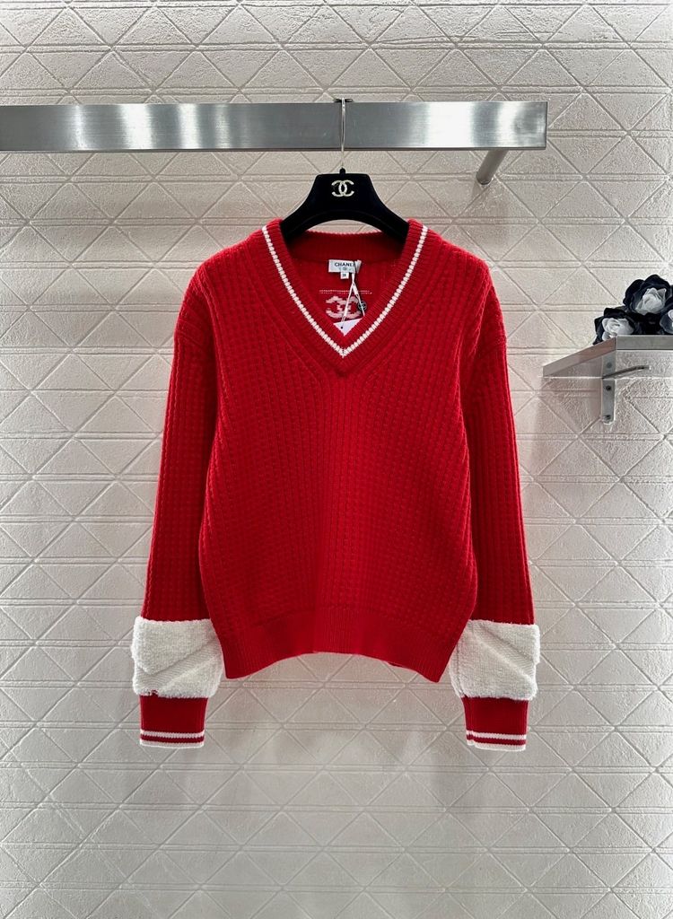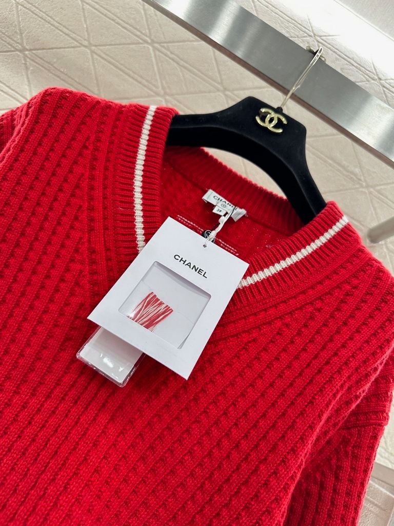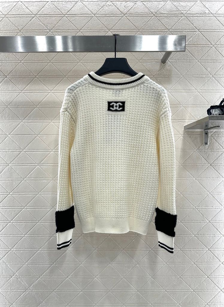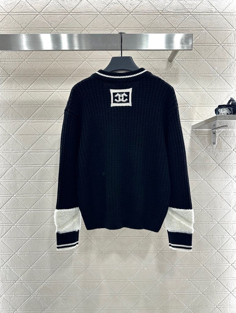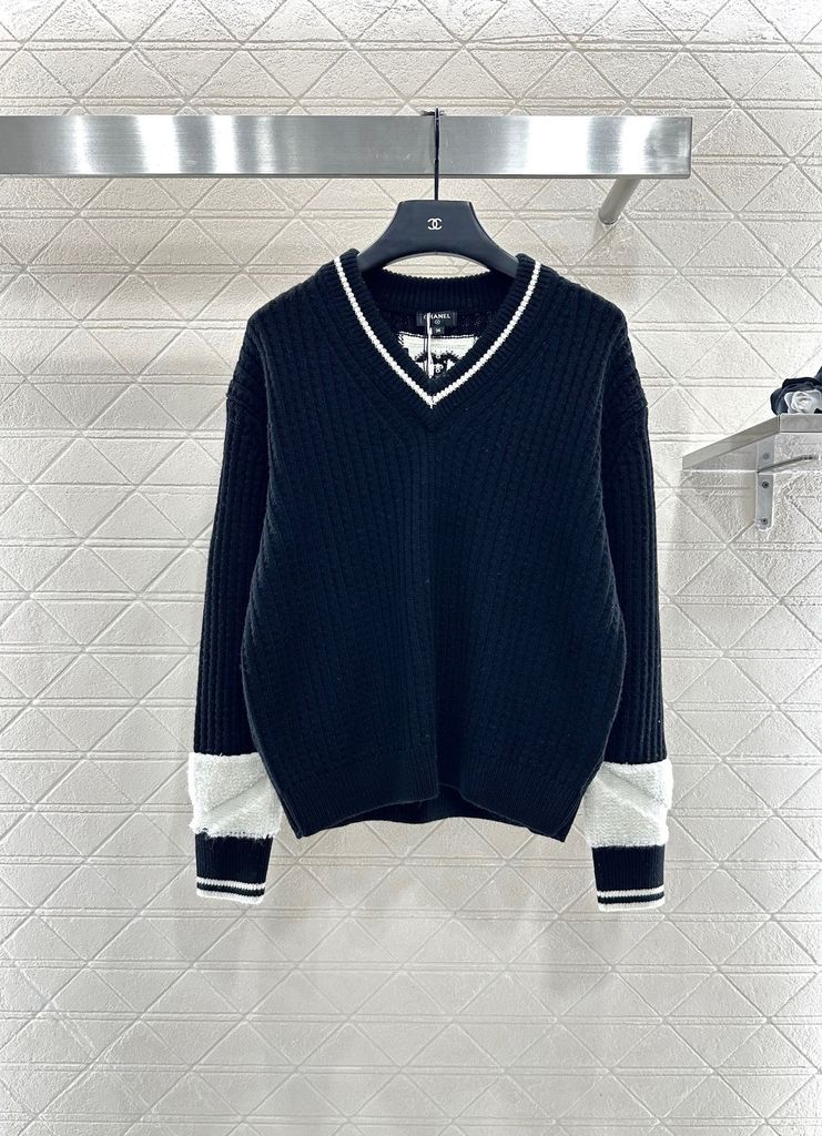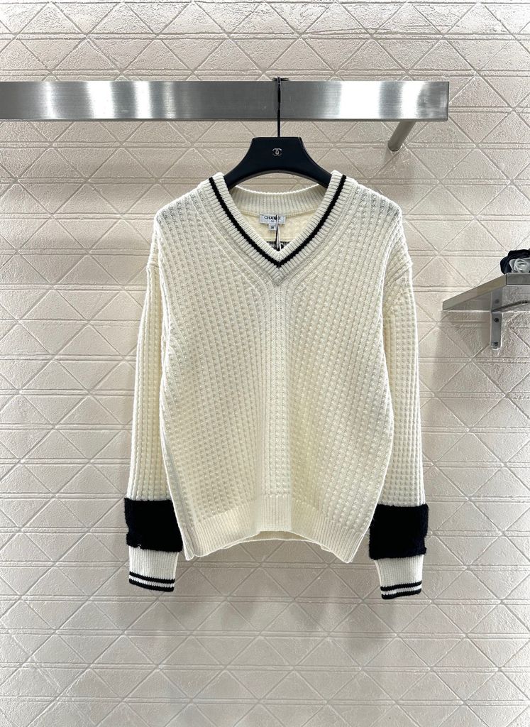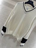 ÁO LEN NỮ CN DÁNG V-NECK DỆT GÂN DỌC – VIỀN TƯƠNG PHẢN & LOGO DOUBLE C THÊU TINH XẢO 1400k (HÀNG ORDER QUỐC TẾ)