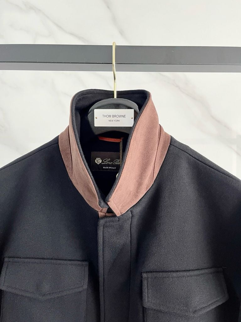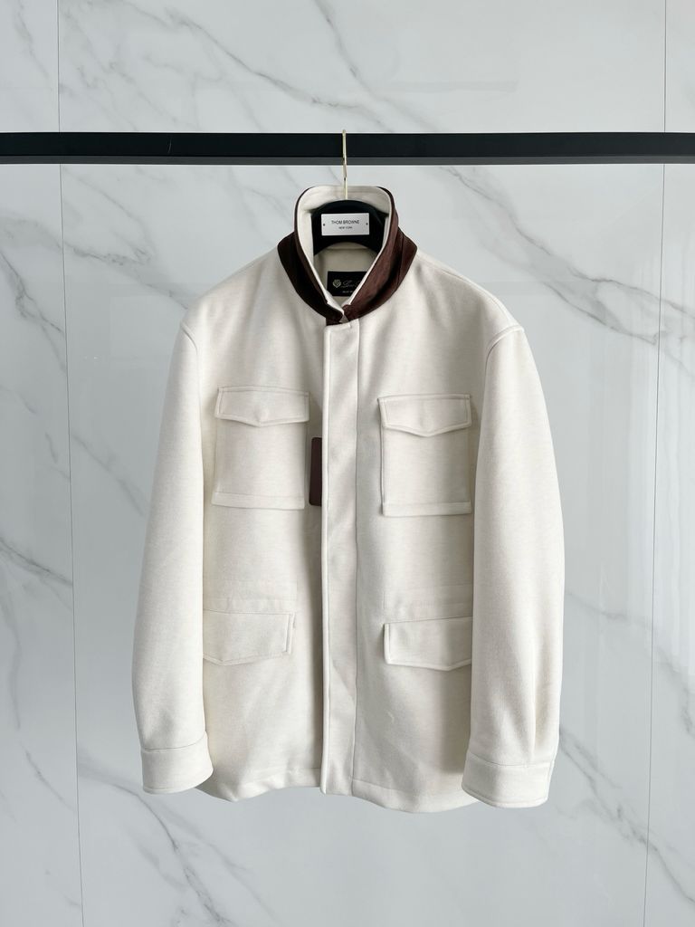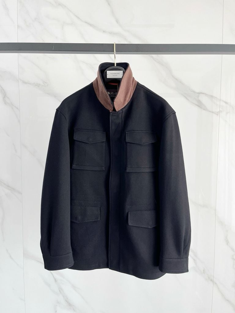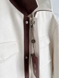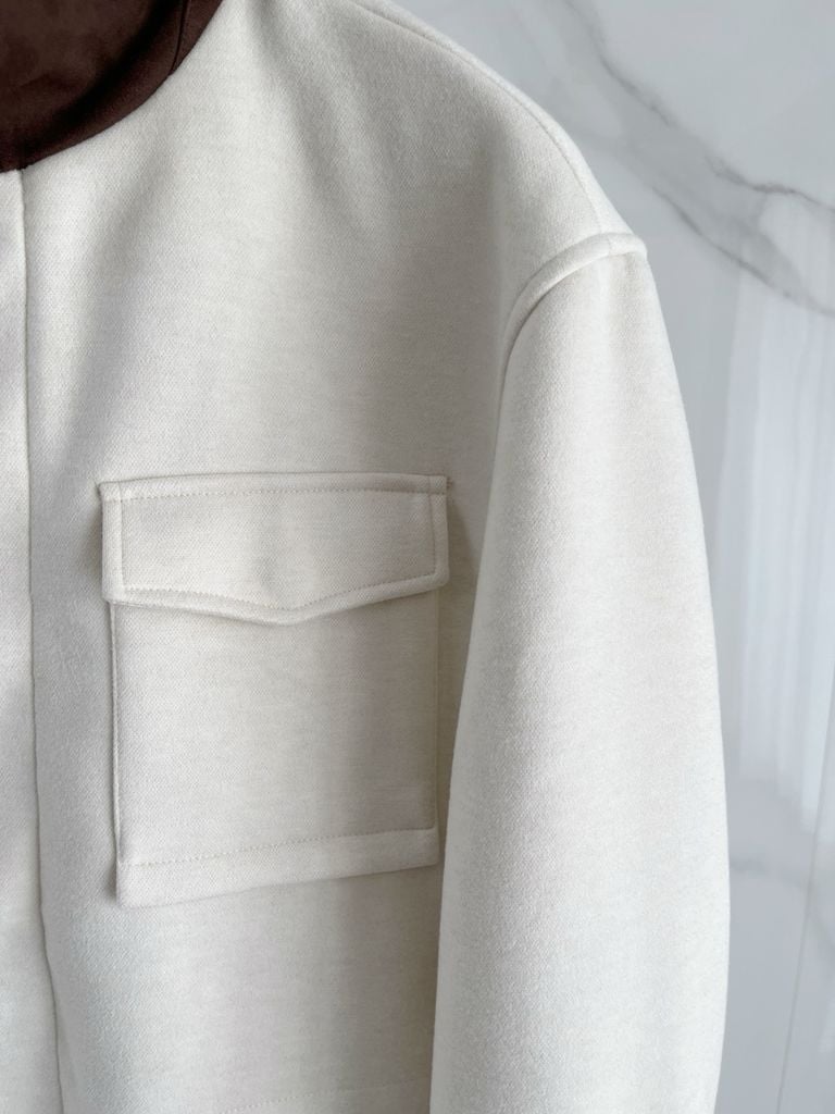 • Cổ đứng phối màu nâu tương phản, tổng thể tối giản hiện đại.