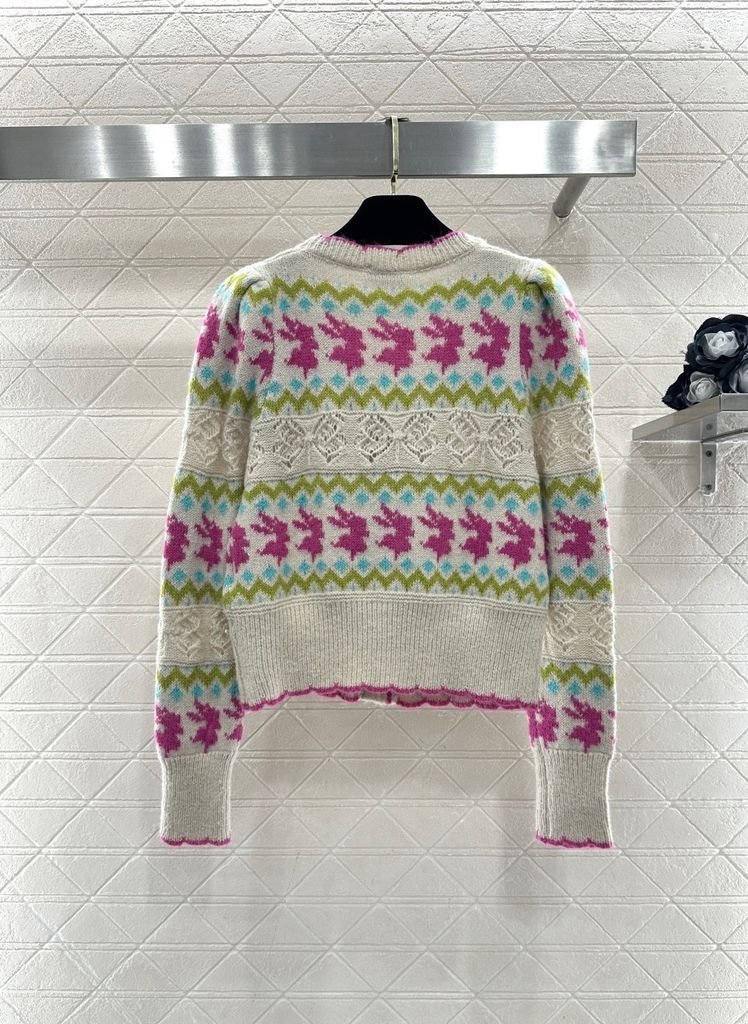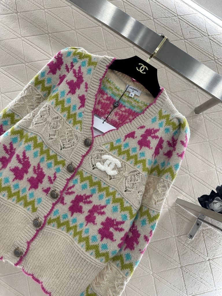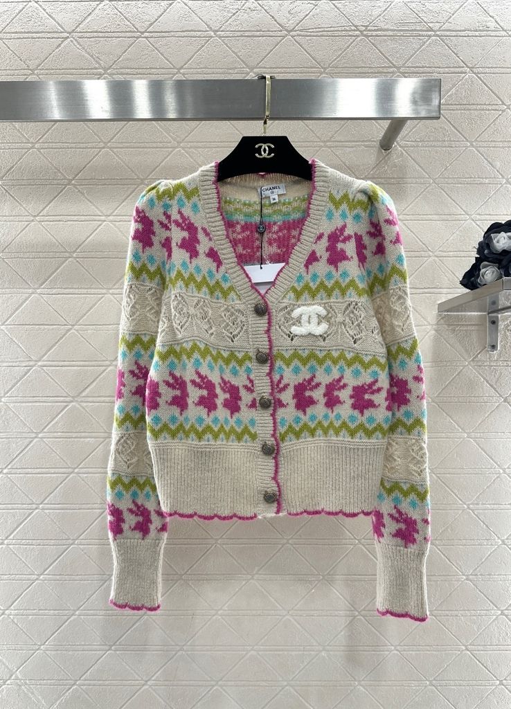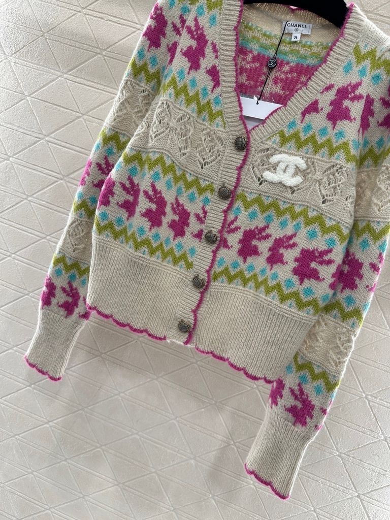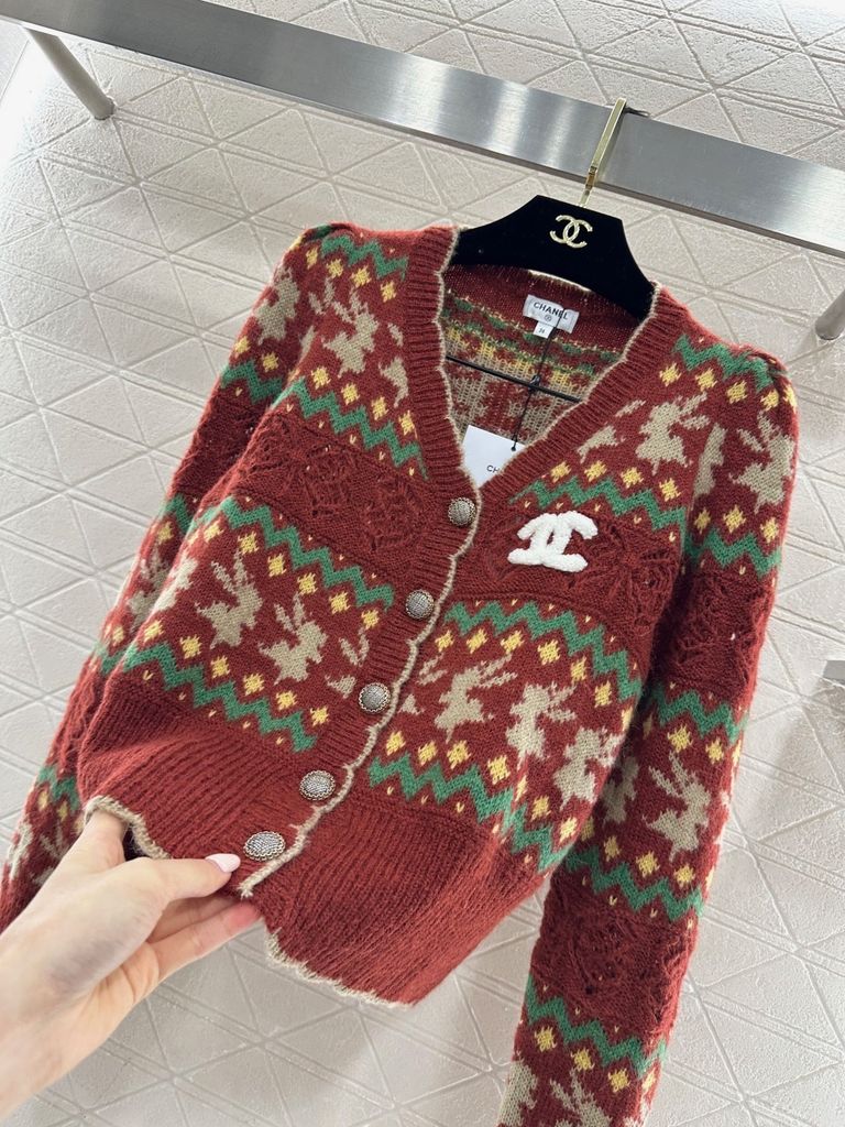 ÁO KHOÁC LEN NỮ CN HOẠ TIẾT JACQUARD SIGNATURE – LOGO ĐÔI C NỔI BẬT – DÁNG V-NECK CROPPED SANG CHẢNH 1300K (HÀNG ORDER QUỐC TẾ)