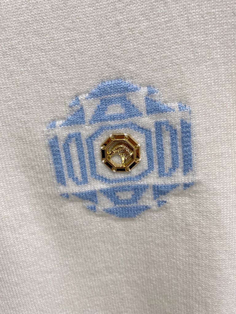 • Logo dệt/đan nổi trên ngực theo bố cục hình học, nhìn gần càng thấy độ tinh.