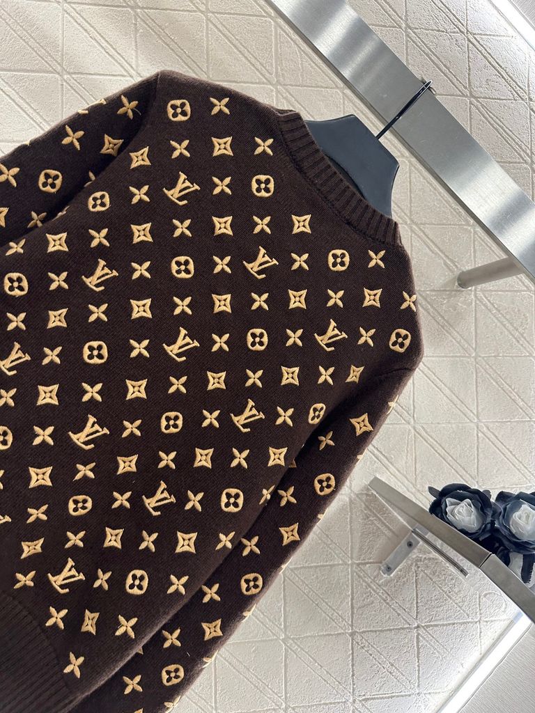 • Vẻ cao cấp hiện đại, dáng tròn cổ, knit dày dặn, họa tiết Monogram phủ full thân tạo hiệu ứng thị giác sang trọng.