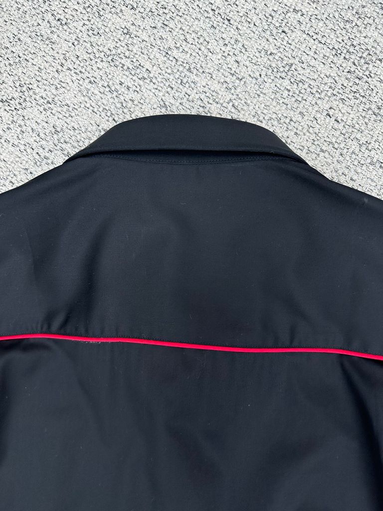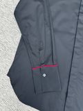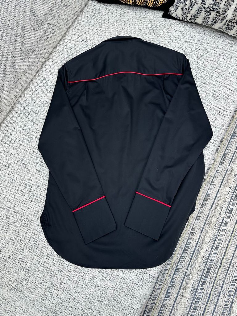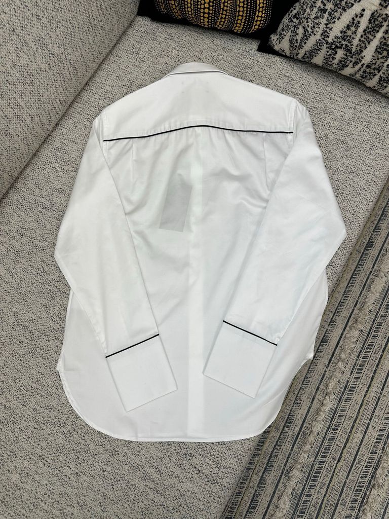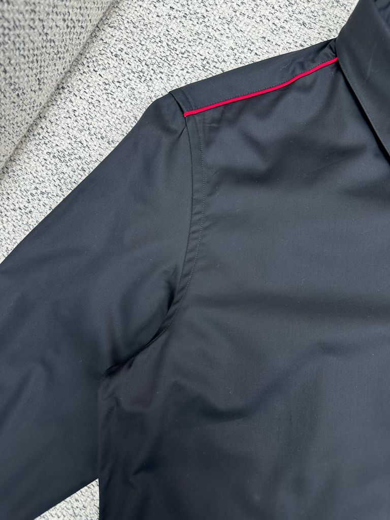 Form sơ mi dựng phom gọn gàng, nhìn “đắt” ngay từ tổng thể. Điểm nhấn đường viền tương phản chạy dọc vai và cổ tay tạo nét nhận diện tinh tế, không phô trương.