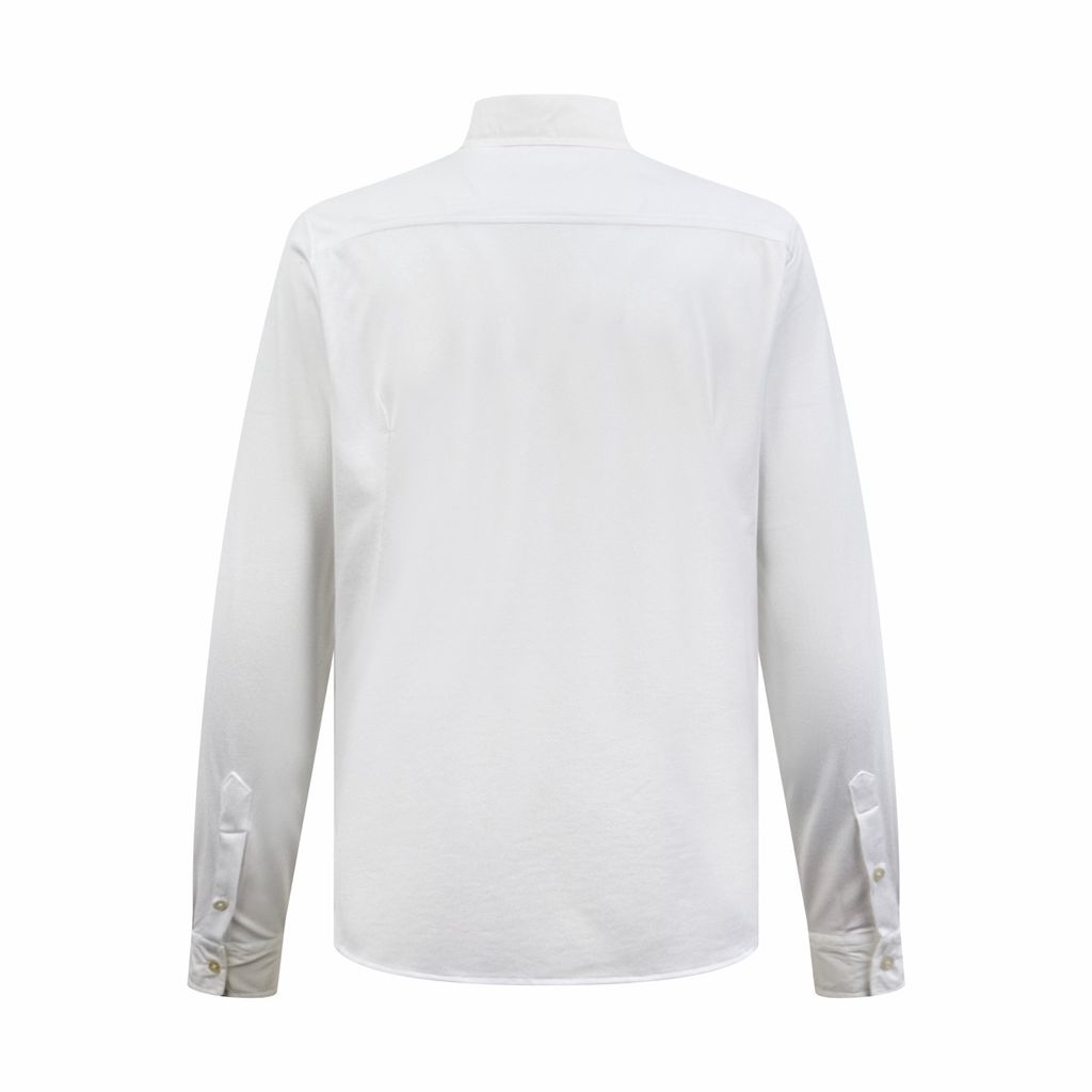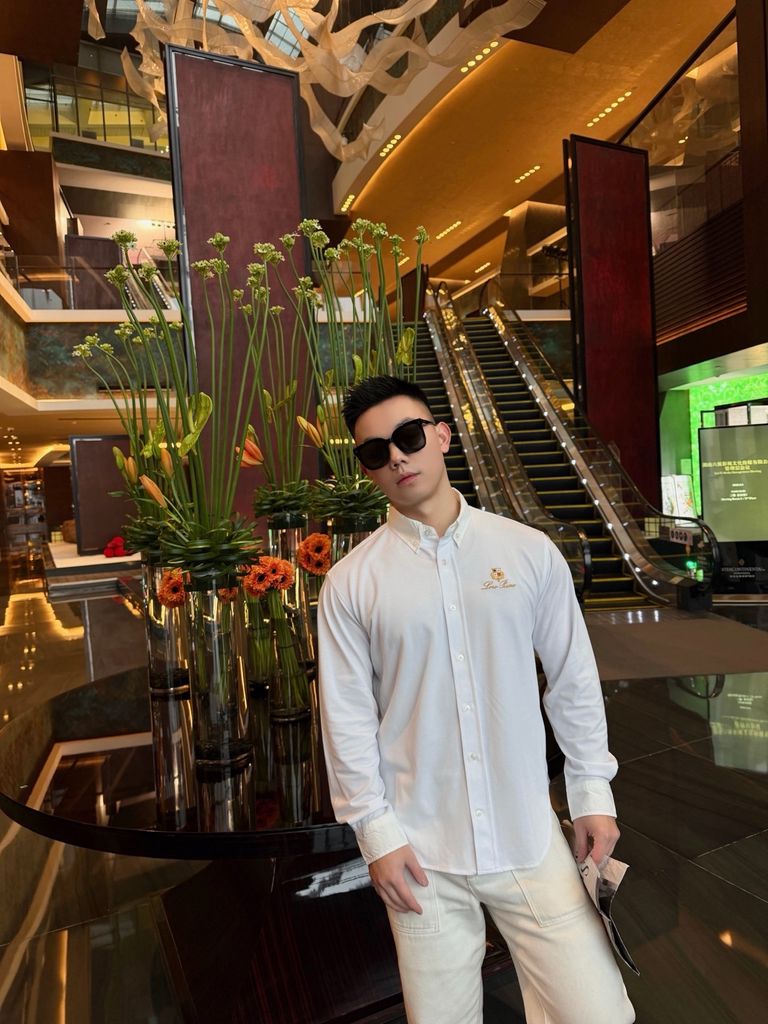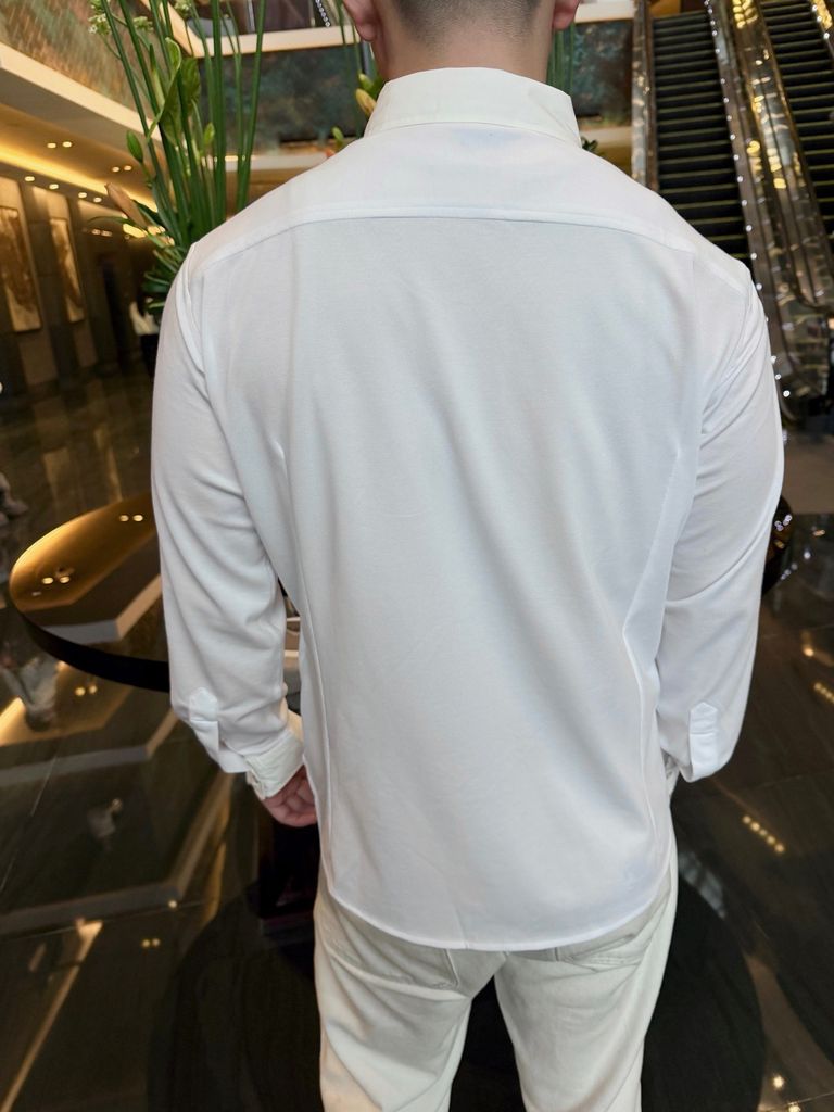 Một phiên bản sơ mi tối giản nhưng tạo dấu ấn rất “đắt giá” nhờ chi tiết thêu huy hiệu và chữ ký trước ngực — gọn gàng, lịch thiệp, lên dáng tinh tế.