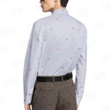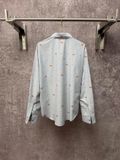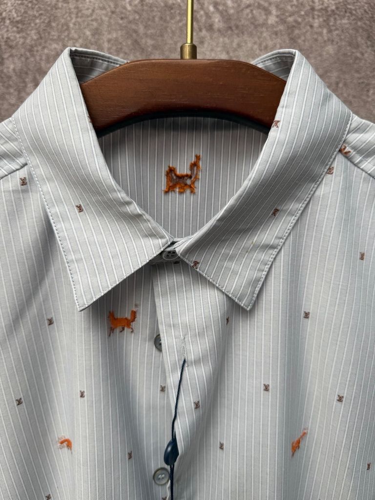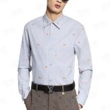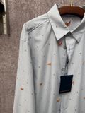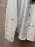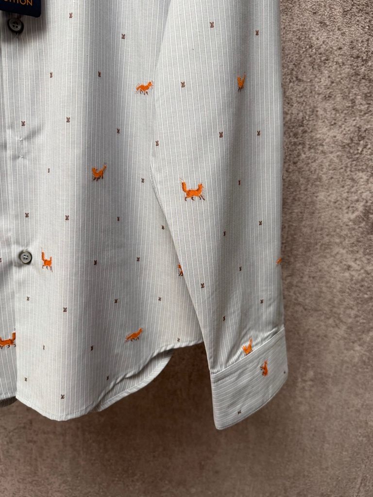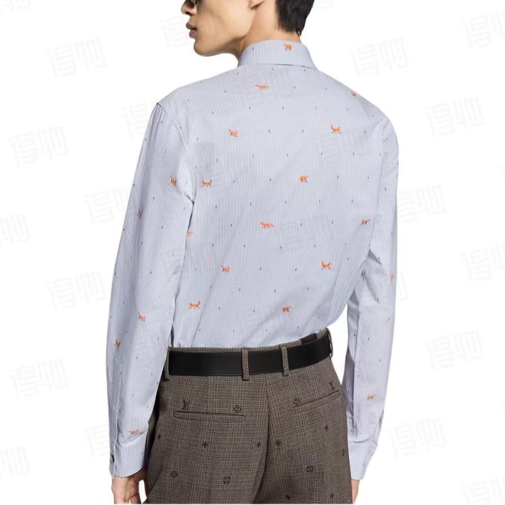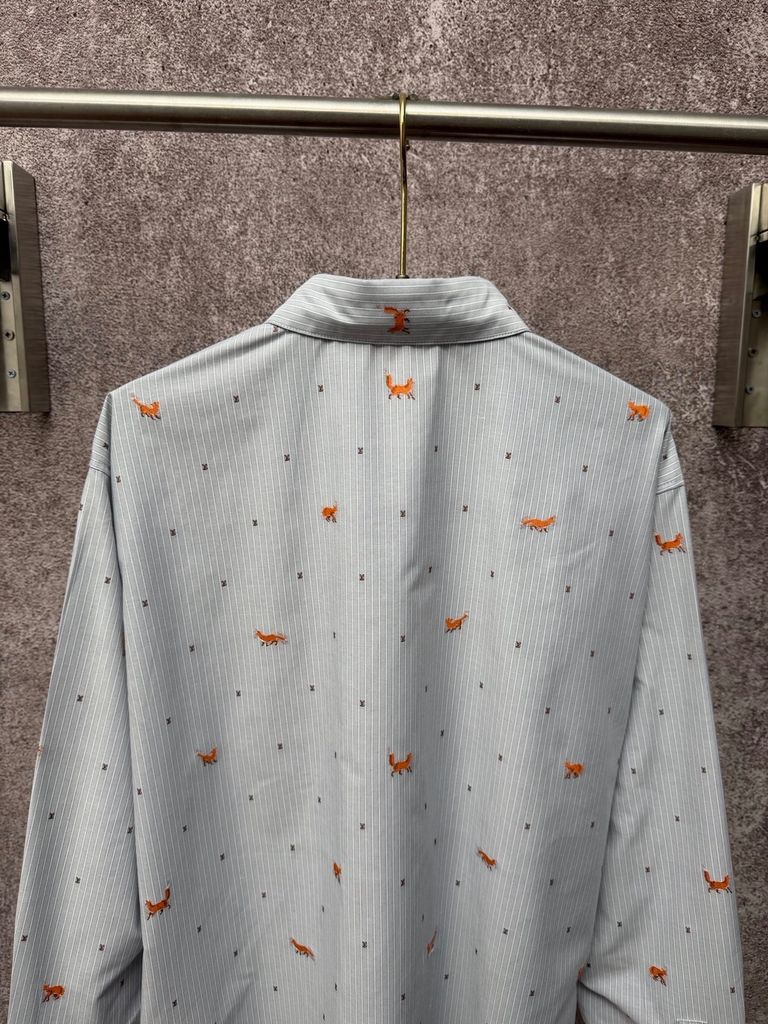 • Nền vải sọc dệt jacquard kết hợp họa tiết fil coupé hình cáo và biểu tượng mini rải đều, tạo chiều sâu thị giác và độ nhận diện rất riêng cho mẫu sơ mi này.