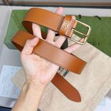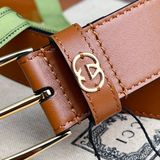 Model No. 673921 AP00G 2535 Chiếc thắt lưng này được làm bằng da trơn màu nâu với khóa vuông và được trang trí bằng các phụ kiện G đôi lồng vào nhau tinh tế. Chữ G đôi tượng trưng cho sự phát triển và lịch sử của thương hiệu là lời nhắc nhở về sự đóng góp của người sáng lập thương hiệu, ông Guccio Gucci cho thương hiệu.