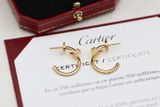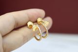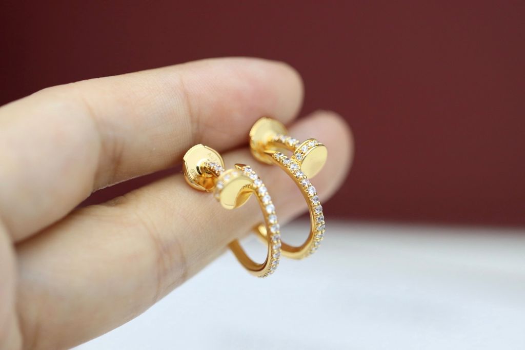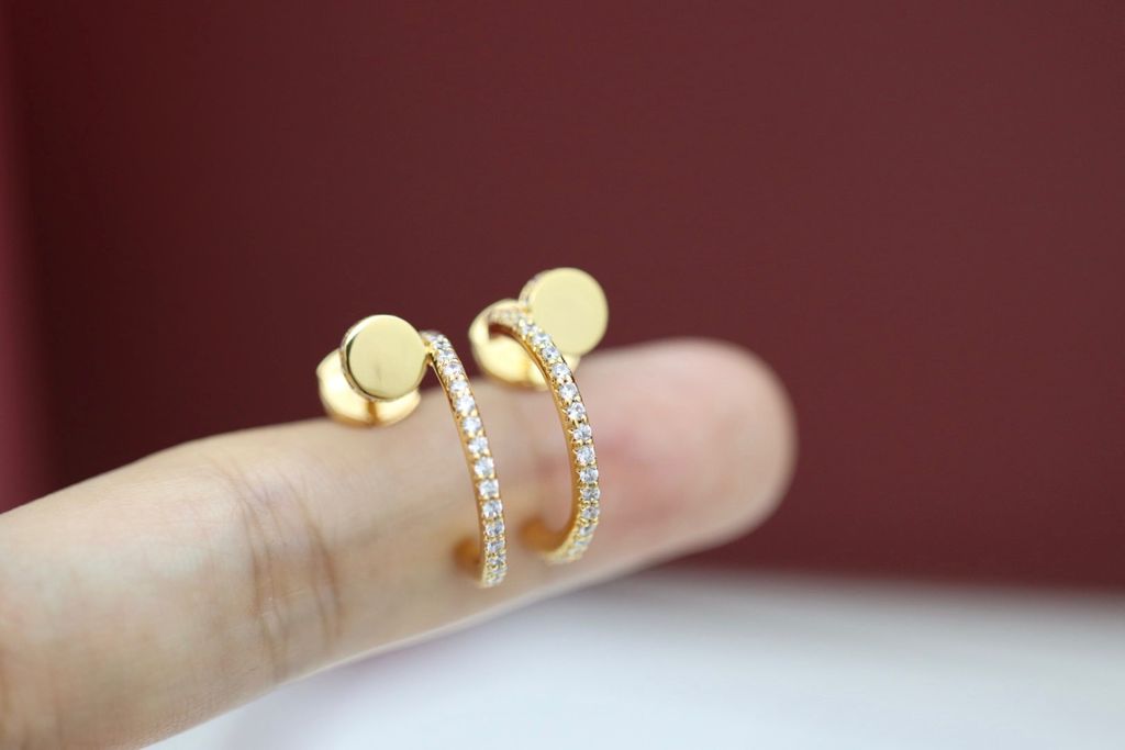 • Phom bông tai dạng vòng ôm tai thanh mảnh, điểm nhấn đầu “đinh tán” biểu tượng – cá tính nhưng vẫn rất thanh lịch