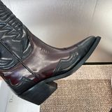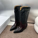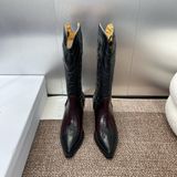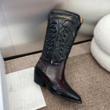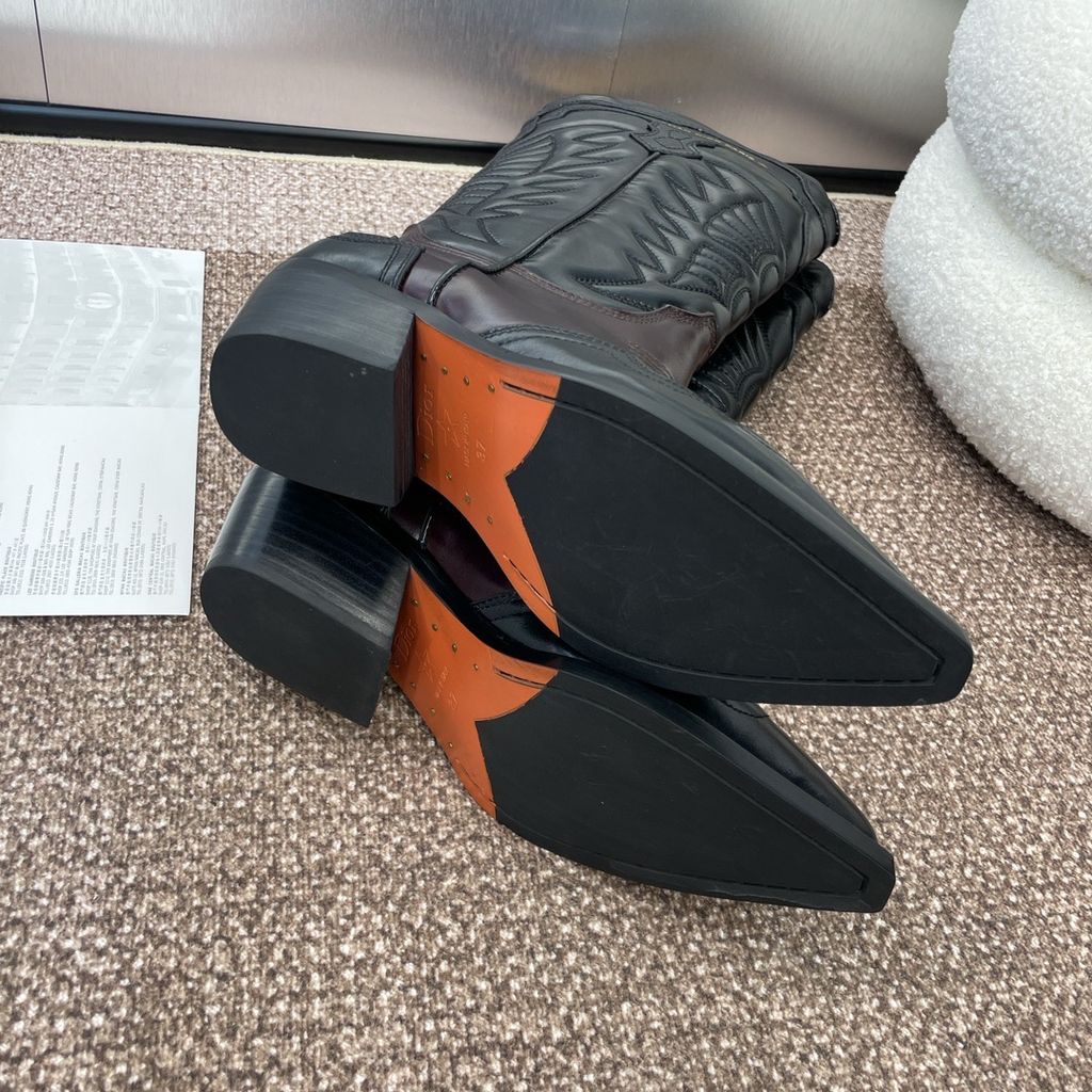 Một đôi boots mang tinh thần miền viễn Tây hiện đại: dáng mũi nhọn tôn chân, thêu nổi tinh xảo trên nền da bê sang trọng – hút mắt ngay khi diện.