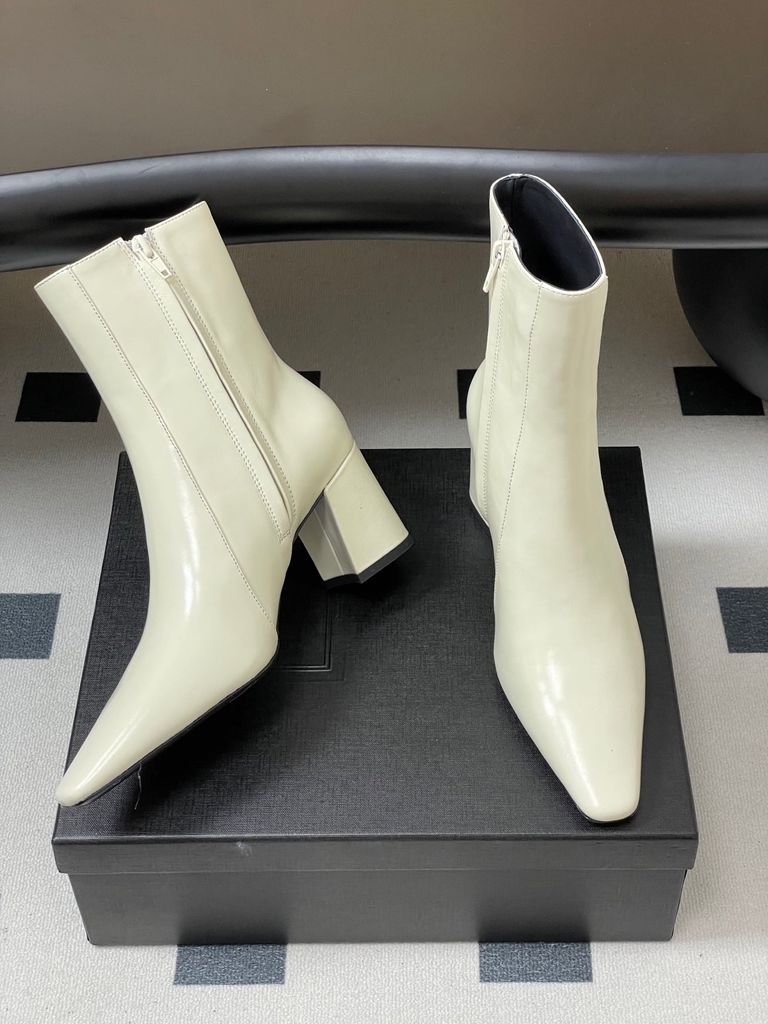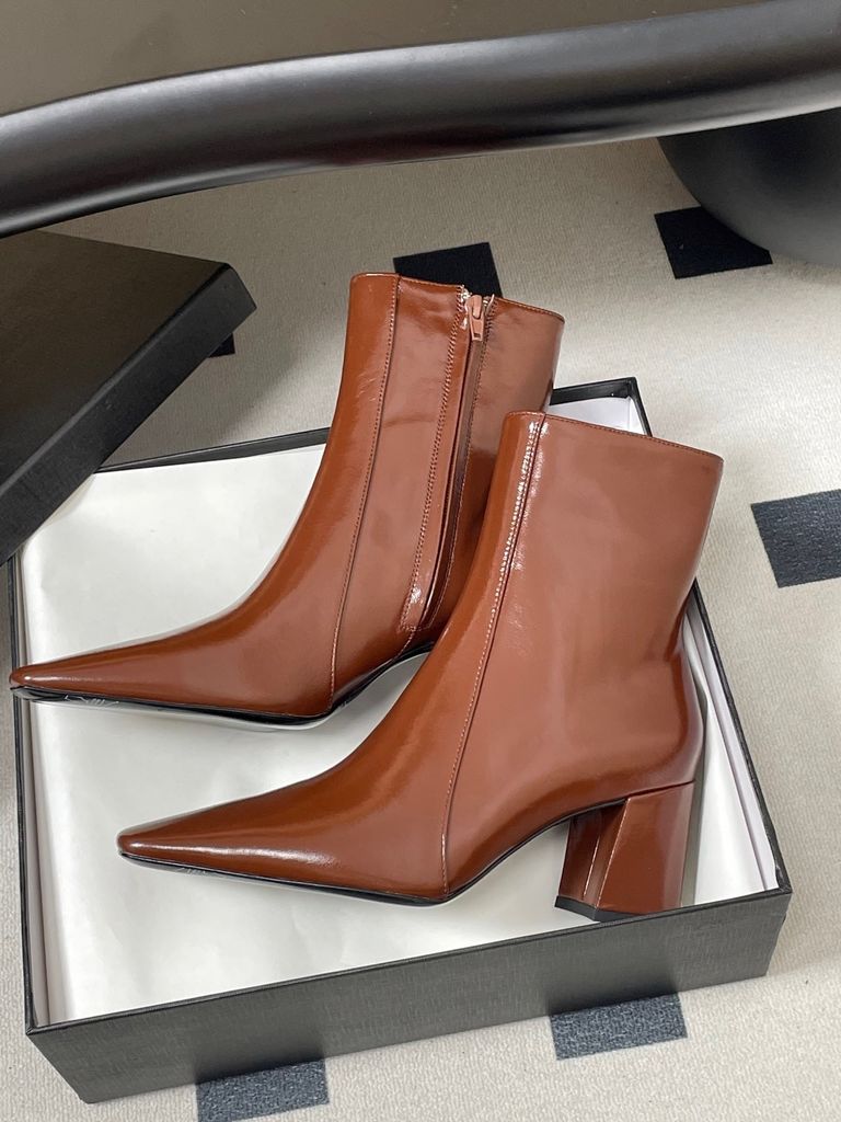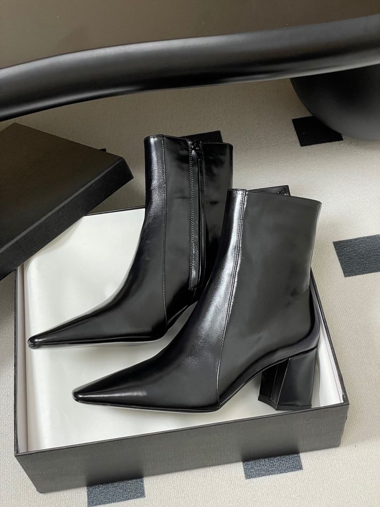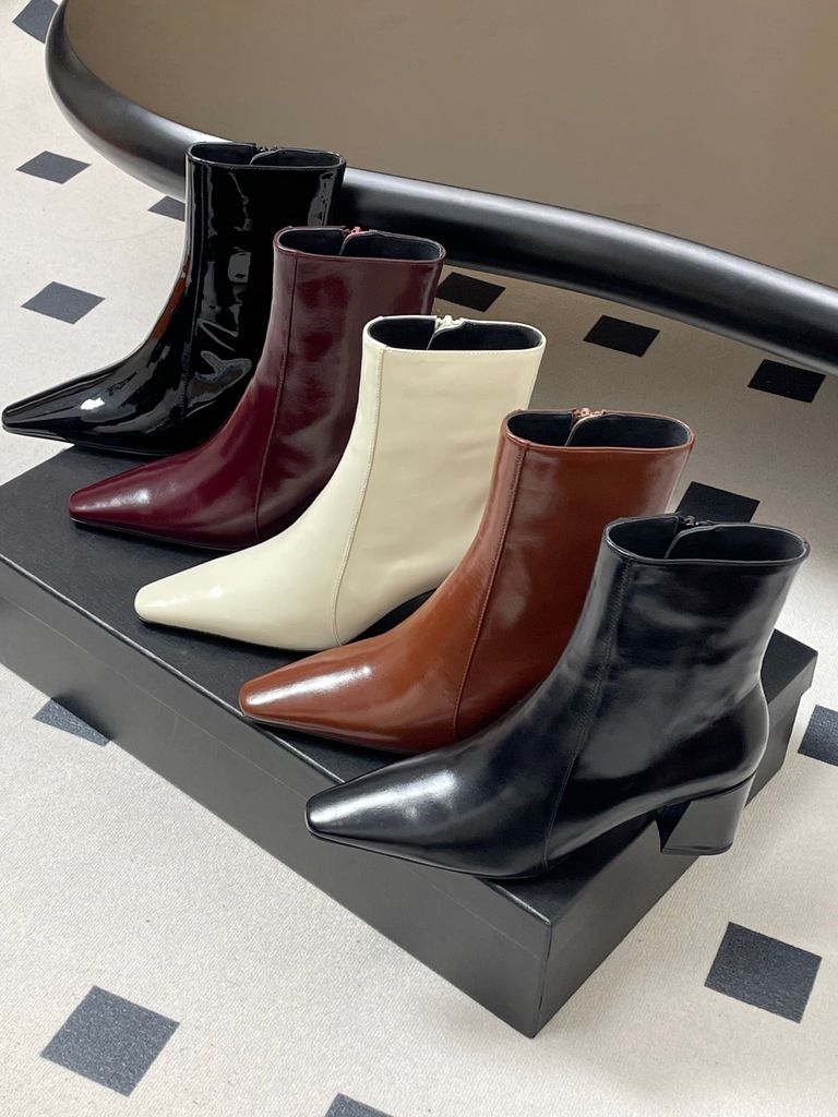 • Dáng boot cổ ngắn gọn gàng, mũi nhọn sắc nét giúp tổng thể chân trông thon và dài hơn