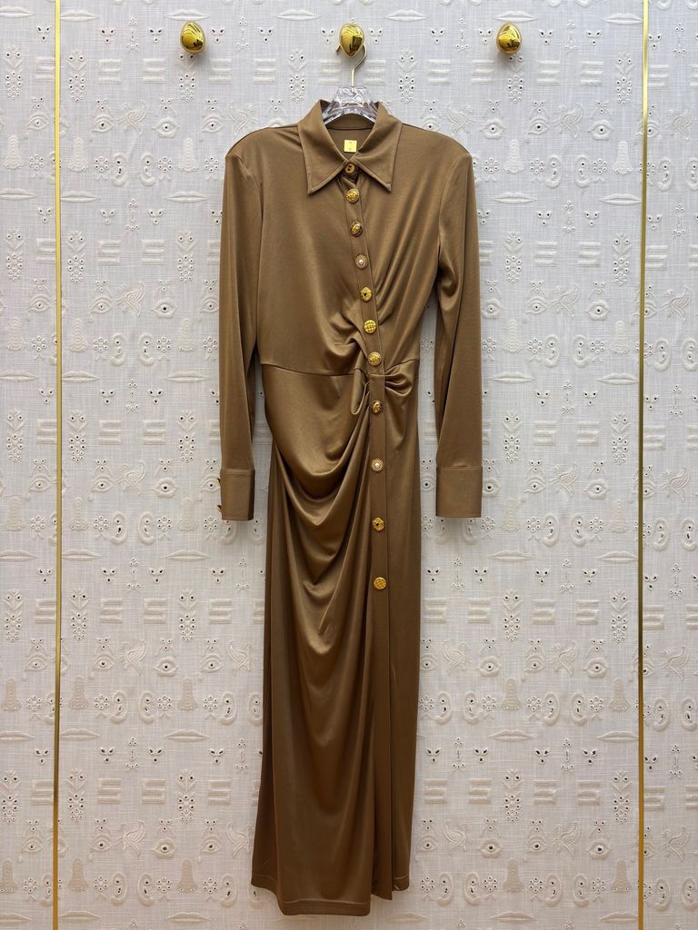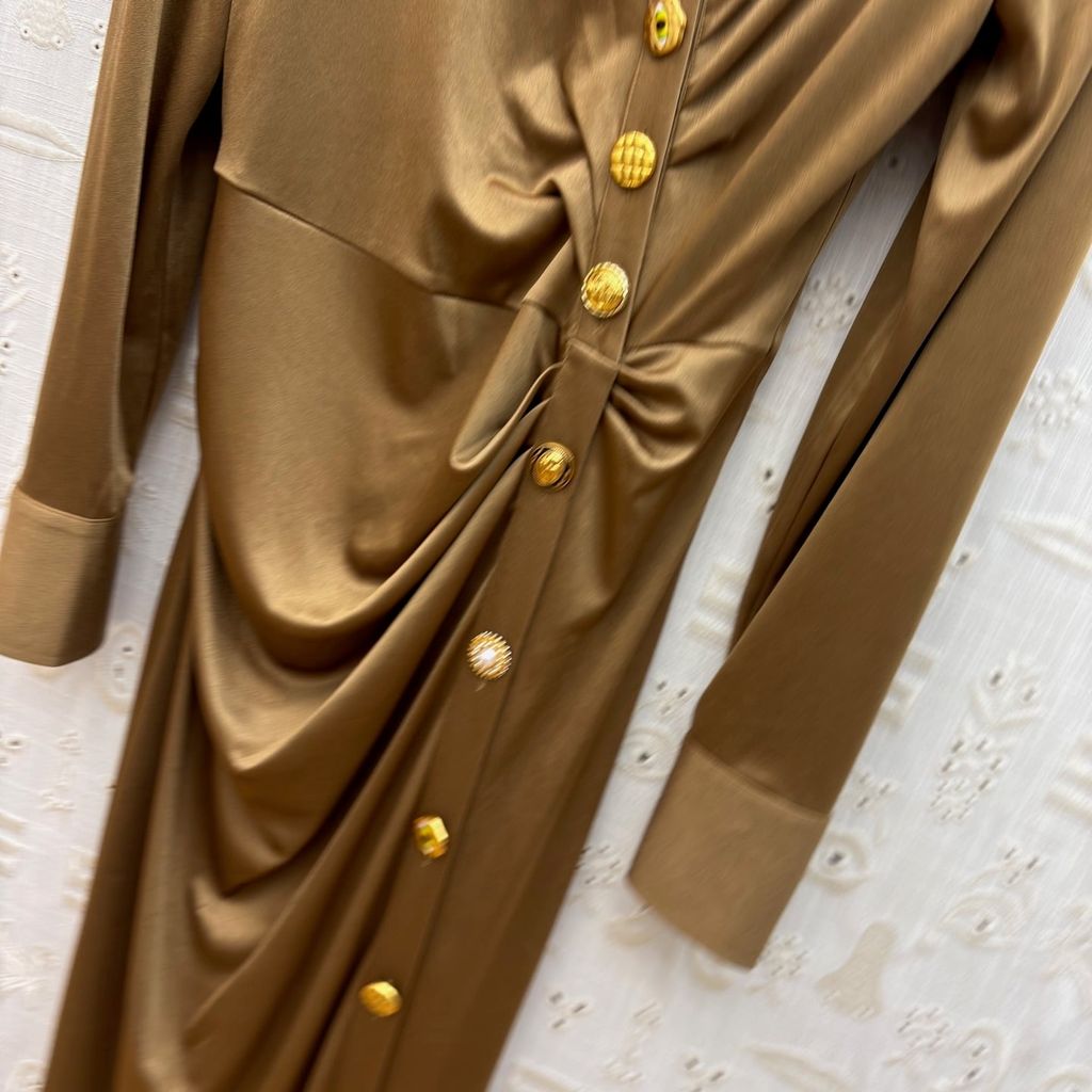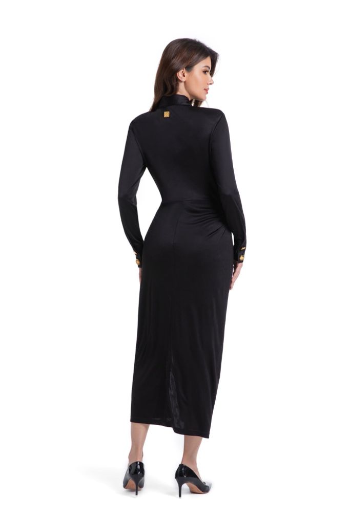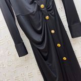 Chiếc đầm dài với hàng nút lệch độc đáo, nhấn nhá những đường draping tinh tế, tạo cảm giác “sang trầm” đúng kiểu châu Âu – mặc đi làm hay đi hẹn hò đều nổi bật mà vẫn giữ được sự kín đáo, thanh lịch.