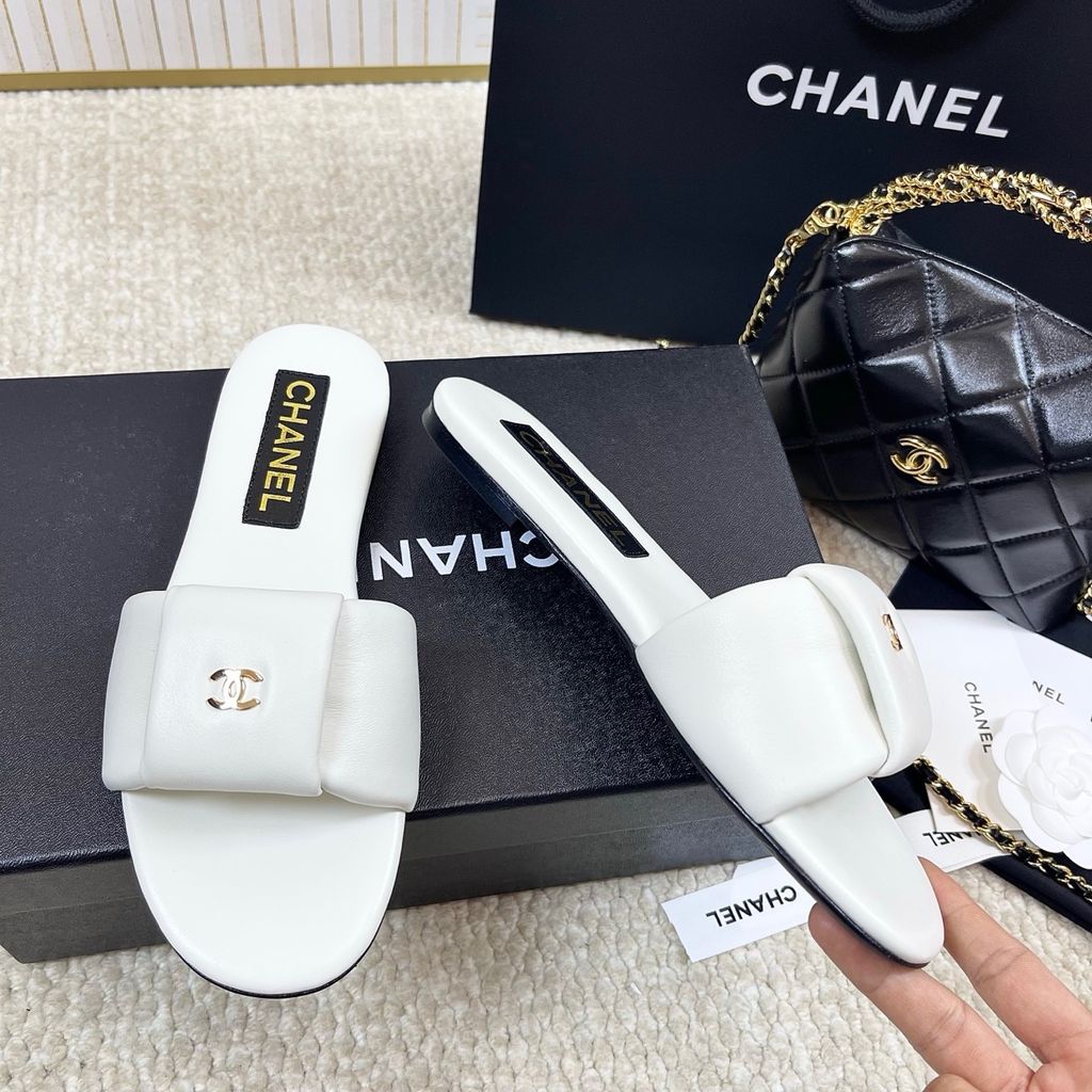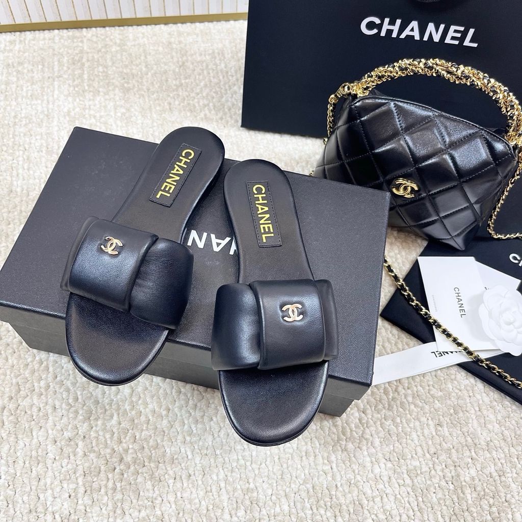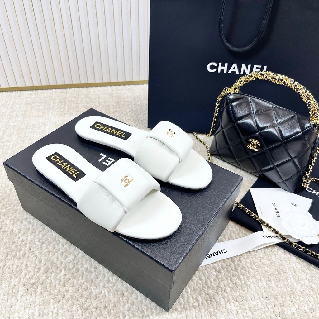 DÉP SLIDE NỮ CHNEL* 2025 – DA CỪU MỀM, ĐẾ DA, LOGO VÀNG THANH LỊCH 1500k