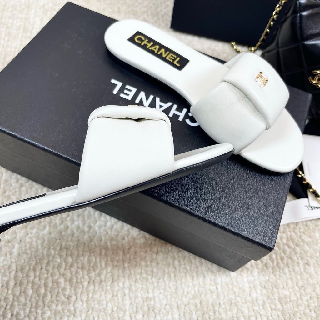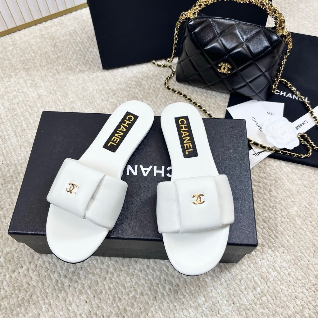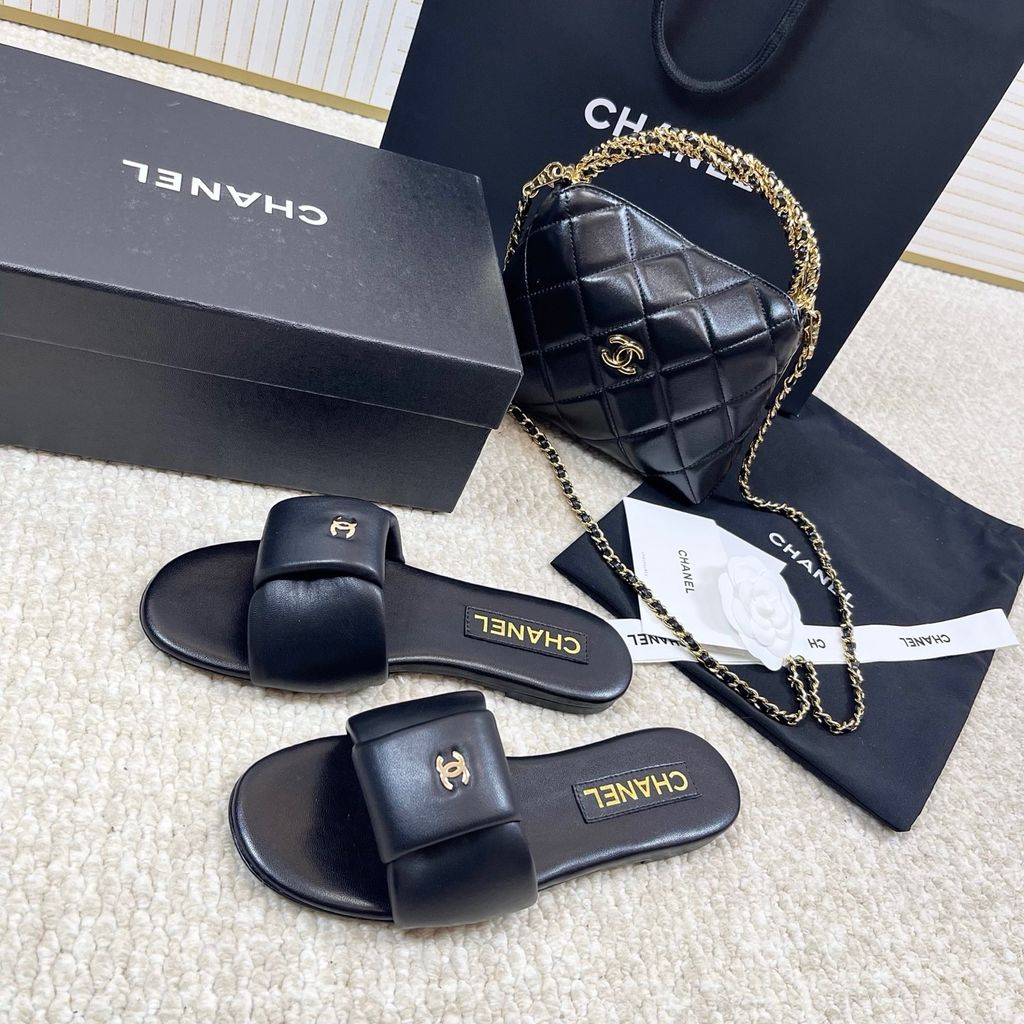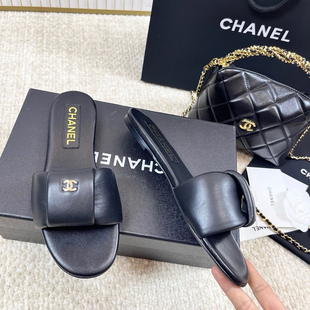 DÉP SLIDE NỮ CHNEL* 2025 – DA CỪU MỀM, ĐẾ DA, LOGO VÀNG THANH LỊCH 1500k
